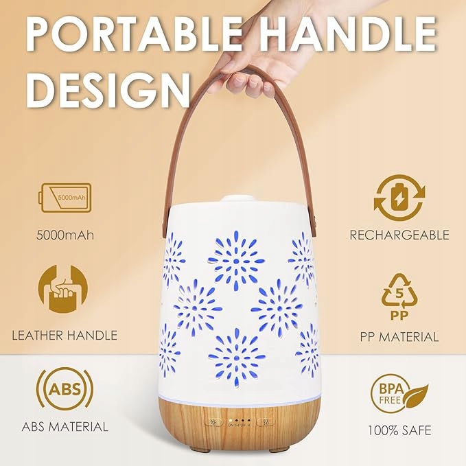 - Наслаждайтесь запахом повсюду - портативный диффузор для ароматерапии имеет держатель кожи и оснащен батареей 5000 мАч. После 4-часовой зарядки он непрерывно выделяет запах в течение 8-10 часов. Вы можете наслаждаться запахом вето, когда они не подключены к электрической сети. Это особенно возможно для использования в ванных комнатах, прицепах для кемпинга, Balkch, солнечных комнатах и т. Д., где нет питания. из эфирных масел оснащены 7 различными светодиодными цветами, поэтому вы можете выбрать свой любимый цвет, соответствующий моменту ароматерапии, и, если необходимо, использовать его в качестве ночи и декоративной лампы. Простая керамика сжигается вручную и может подчеркнуть его элегантность в любое время, независимо от того, где она размещена, и подходит для многих стилей дизайна интерьера. Диффузор для ароматерапии эфирных масел изготовлен из материала ABS для перемещения, используя тот же материал PP, который в случае детских бутылок не содержит BPA, с функцией отключения без воды, очень подходящих для семей с детьми. или домашние животные. Существует устойчивая коррозия эфирных масел и остается дольше, благодаря которой его можно использовать в течение длительного времени. может быть перемещен независимо от власти дома и снаружи. Это отличный опыт, чтобы взять диффузор Salubirto в походе или пикник. Независимо от того, выращиваете ли вы свежий воздух йоги или медитацию, беспроводной диффузор эфирных масел предоставит вам запах, который вам необходимо быстрее ввести правильный наряд