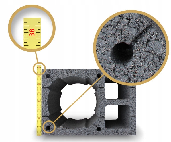 - Ширина блока дымоходов 38 см (более толстая стена 5 см), которая, в отличие от блоков конкуренции, обеспечивает лучшую изоляцию и стабильность дымоходов