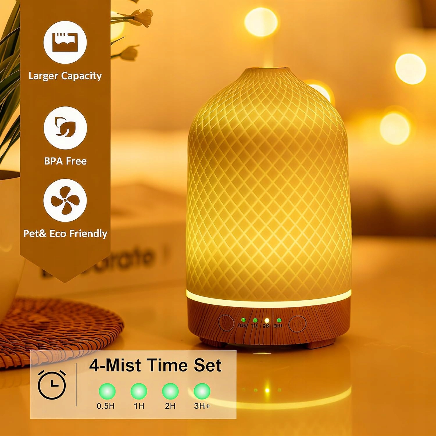 Ультразвуковая технология «Whisper Quiet»: в этом керамическом диффузоре эфирного масла используется передовая ультразвуковая технология (<30 дБ), что делает его чрезвычайно тихим и не издает раздражающего шума, пока вы спите или работаете. Ультразвуковой диффузор помогает создать спокойное, расслабляющее, ароматное пространство.