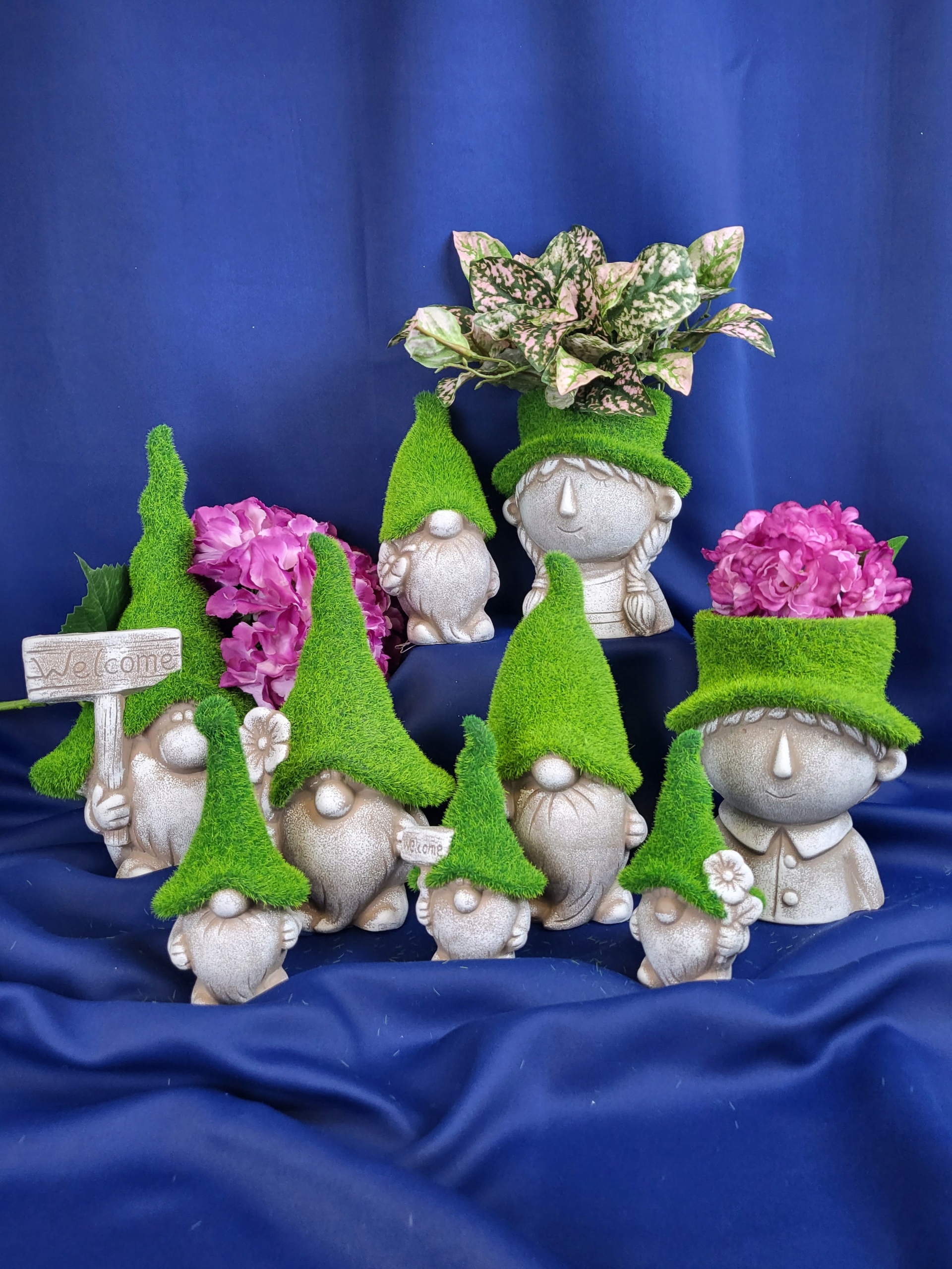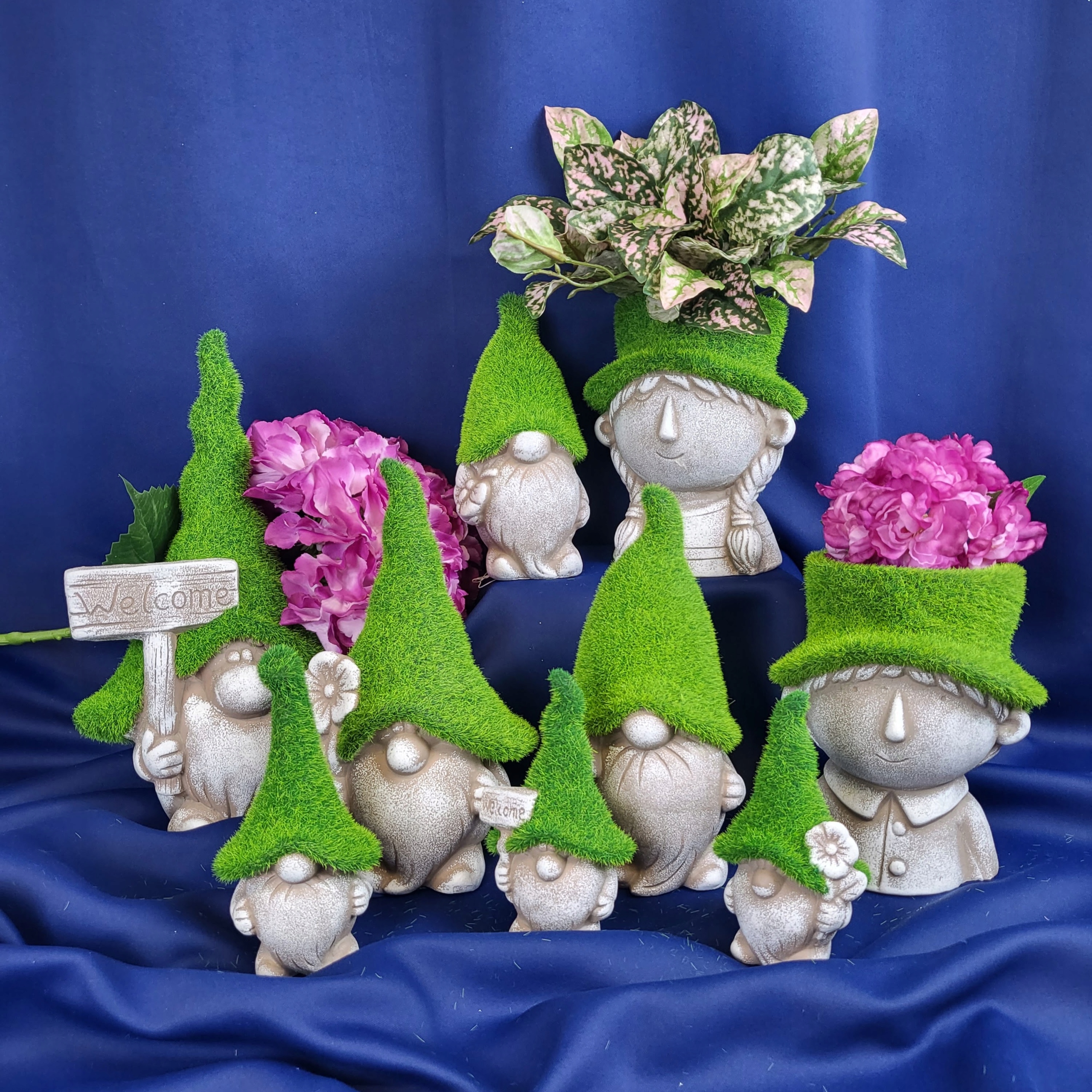 Керамическая фигурка гнома в зеленой шапке, напоминающей мох, непременно добавит атмосферы саду.