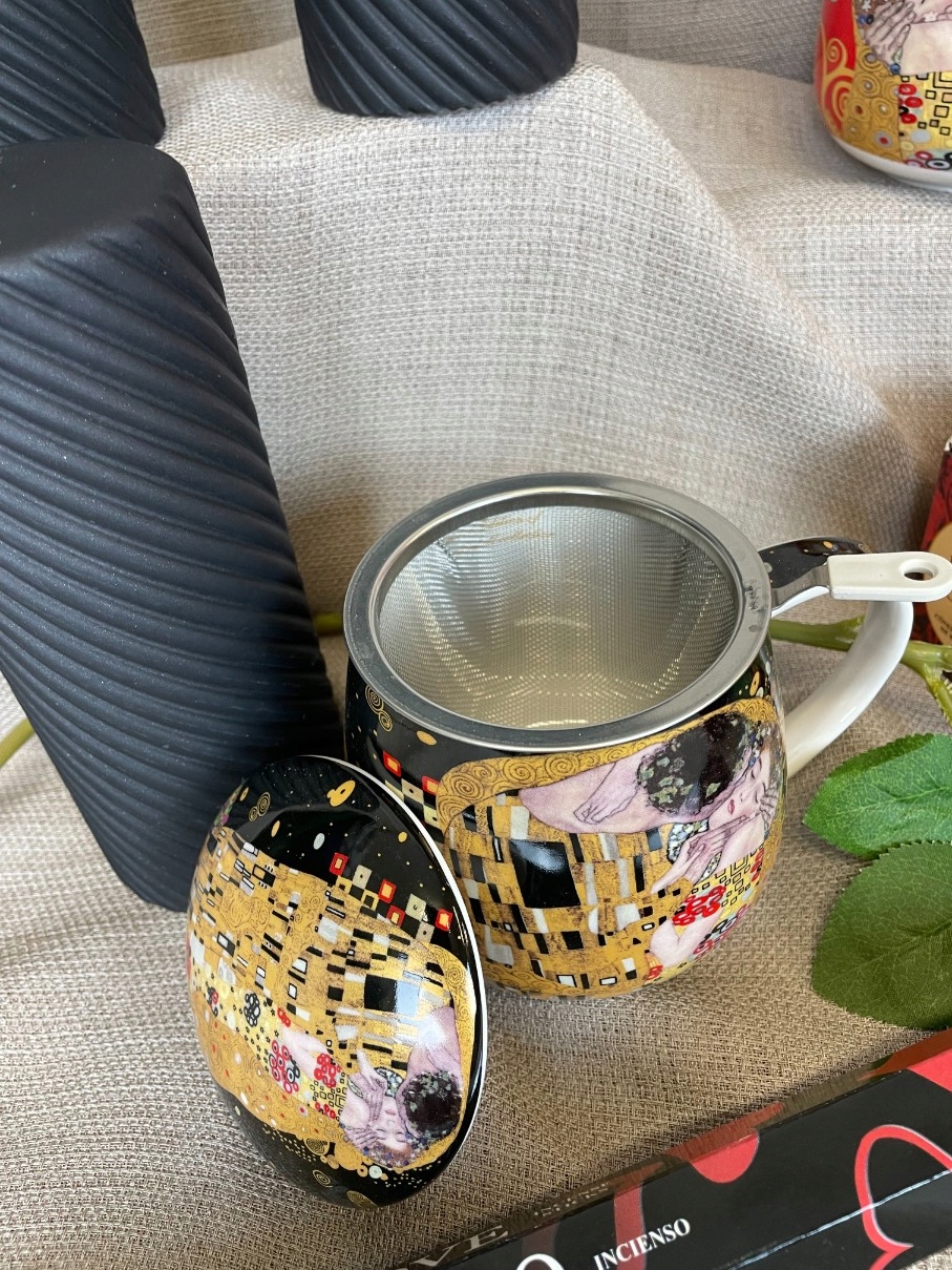 Кружка с заварочным устройством, украшенная картиной Густава Климта «Поцелуй».