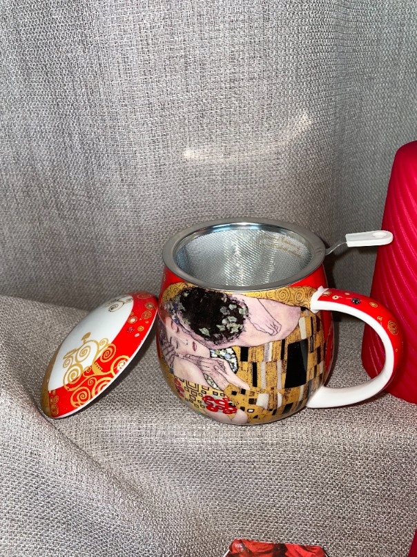 Кружка с заварочным устройством, украшенная картиной Густава Климта «Поцелуй».