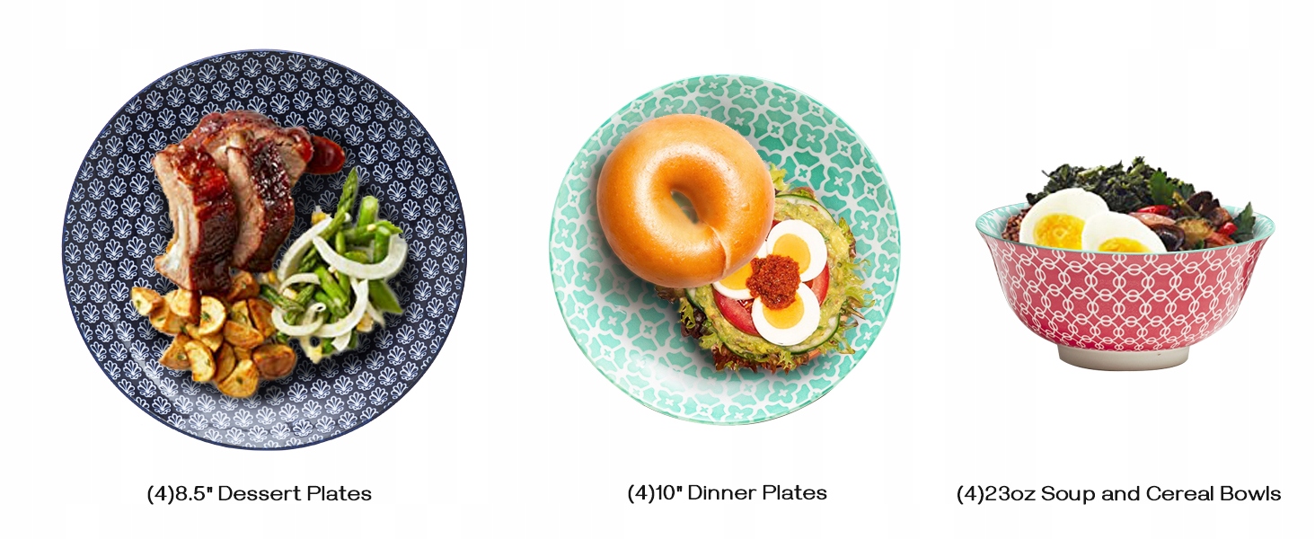 - Упаковочный содержимое : обслуживание для 4 человек, содержит 4 из следующих элементов: проектные пластины 26,7 см, 21,5 CM Dessert Dessert Plates и Soup/Заке. Подходит для семейных ужинов, хранения еды, ресторанных услуг, развлекательных мероприятий и рождественских подарков.