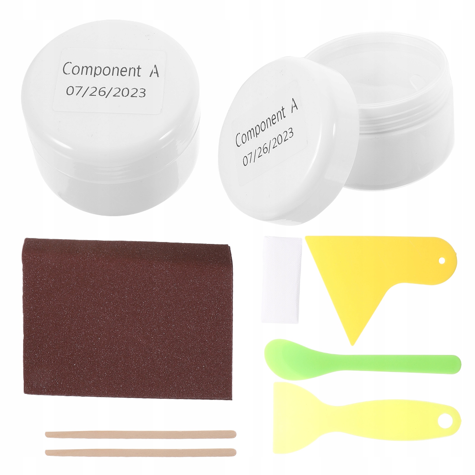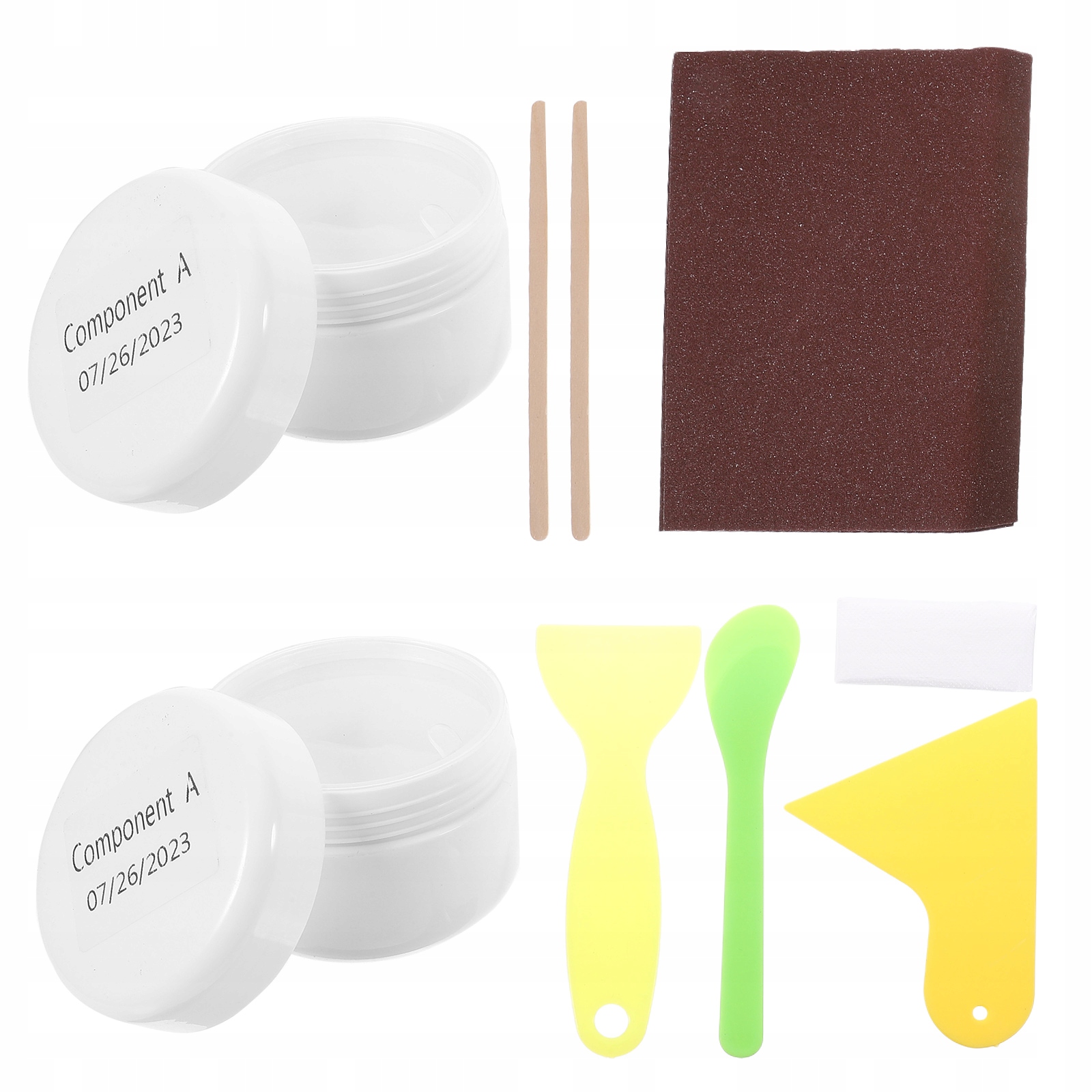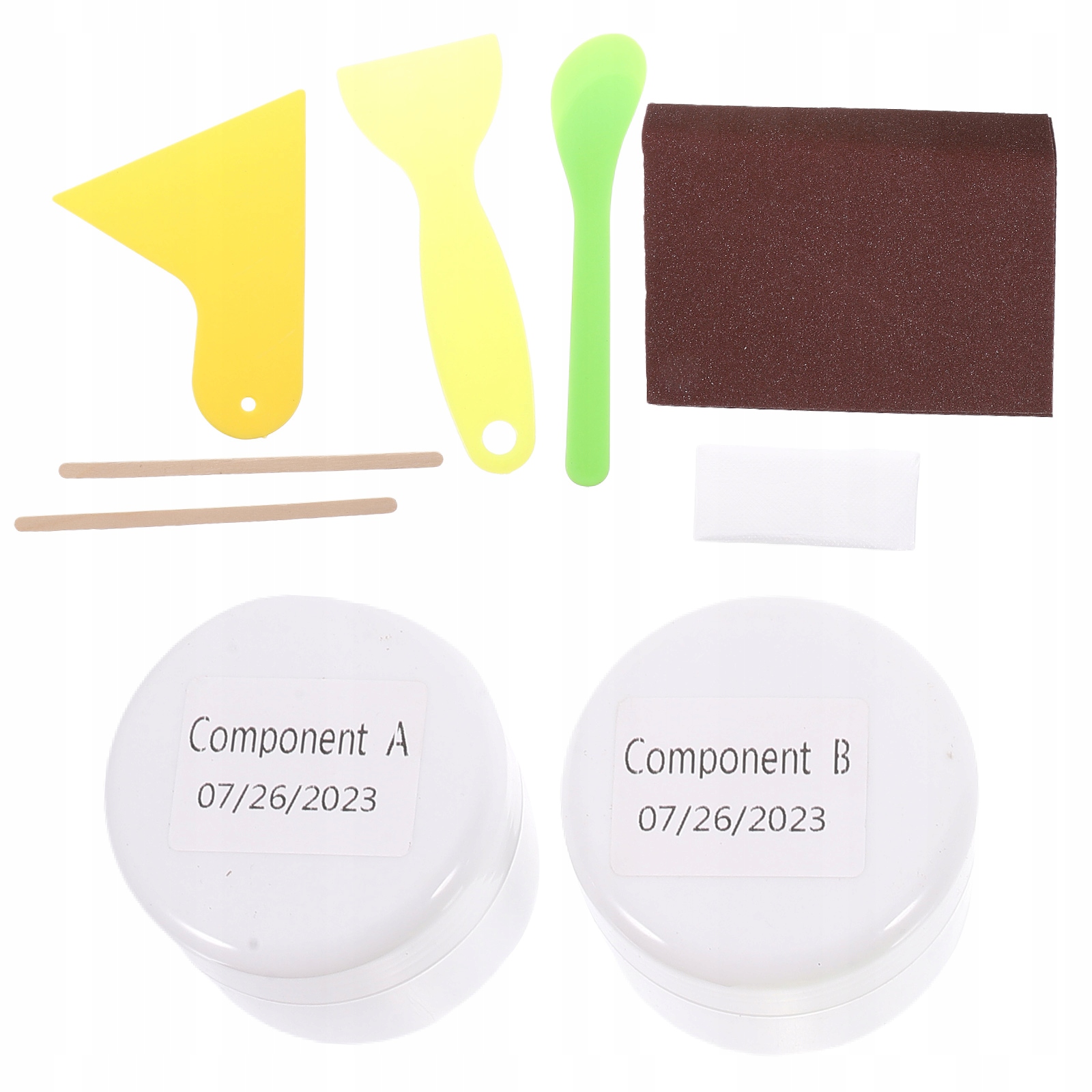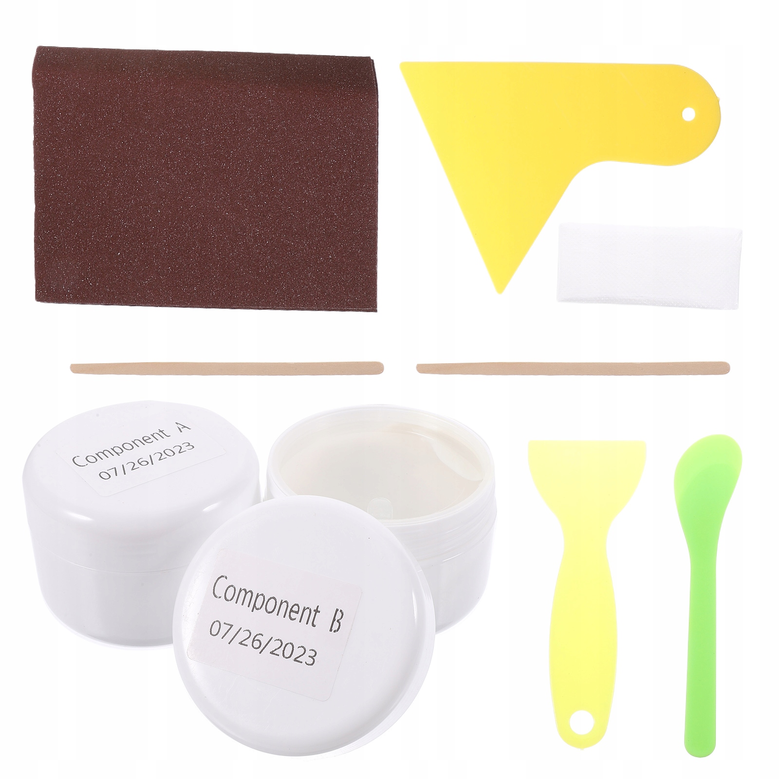 ✅ 1 ремонтная паста A 1 ремонтная паста B 2 деревянные палочки для смешивания 3 скребка 1 наждачная бумага 1 пара перчаток