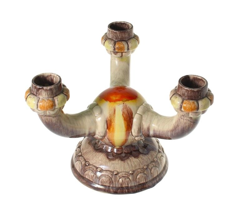 Глазурный подсвечник на три свечи в оттенках коричневого, белого, желтого и красного. Происхождение неизвестно. По стилю модели видно, что она изготовлена в 1950-1960-е годы.