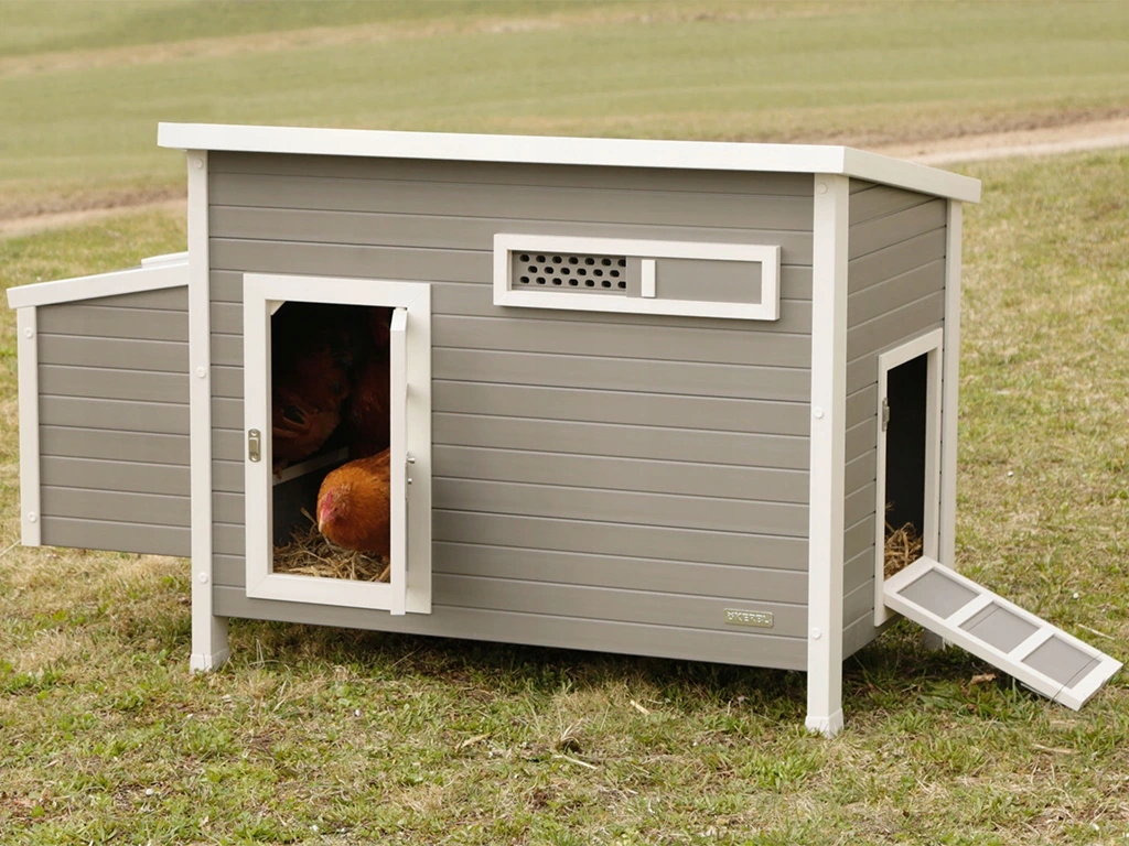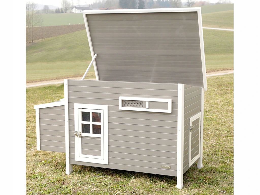 Курин изготовлен из экологически переработанного материала (60% пластик, 40% дерево) весит около 35 кг, поэтому обеспечивает высокую устойчивость. Материал курятника хорошо изолирует, водонепроницаем и не требует ухода. Штора изготовлена из ЭКО пластика и устойчива к УФ-излучению и погодным условиям в любое время года. ЭКО-пластик отличается тем, что не скручивается, не трескается, не плесневеет и легко чистится. Циркуляция воздуха в курятнике обеспечивается передним раздвижным окном.