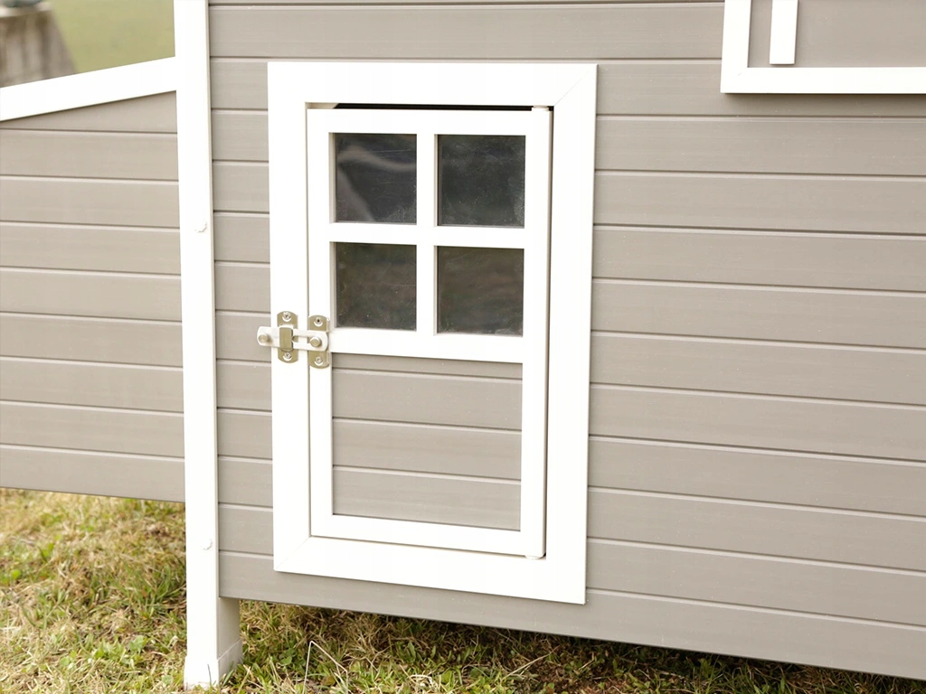 Для удобства доступа курятник оборудован двумя дверями. Одна дверца с защелкой расположена в передней части курятника и служит для удобной смены воды, кормления и хорошего доступа в курятник. Сбоку курятника также имеется распашная дверца, которая позволит цыплятам легко выходить в сад или бегать. Эта дверь запирается на защелку, поэтому хищник не сможет ее открыть.