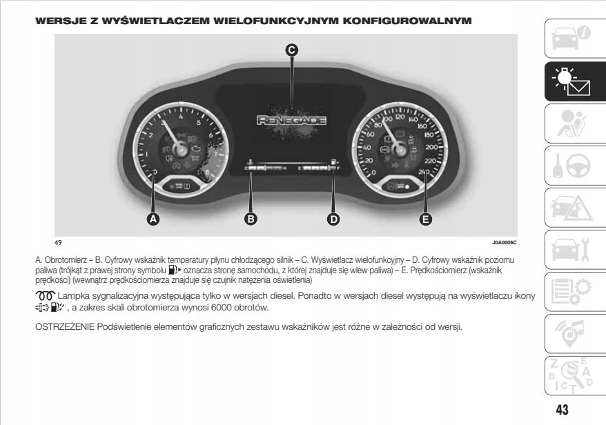 Руководство по эксплуатации Jeep содержит все версии оборудования и полезную информацию о том, как эффективно и безопасно использовать автомобиль, например: - индикаторы, контрольные лампы, открывание и закрывание - освещение и обзорность, сиденья, отсеки для хранения вещей, отопление, вентиляция, кондиционирование воздуха. - советы по вождению, эксплуатации, обслуживанию автомобиля - уровни жидкостей, проверка и доливка, аварийные операции, замена колес, предохранителей, замена лампочек - технические данные... и многое другое, дающее путешественникам ощущение безопасности и комфорта. Польское законодательство обязывает продавца приложить к автомобилю руководство по эксплуатации на польском языке. Руководство пользователя автомобиля новое, на польском языке.
