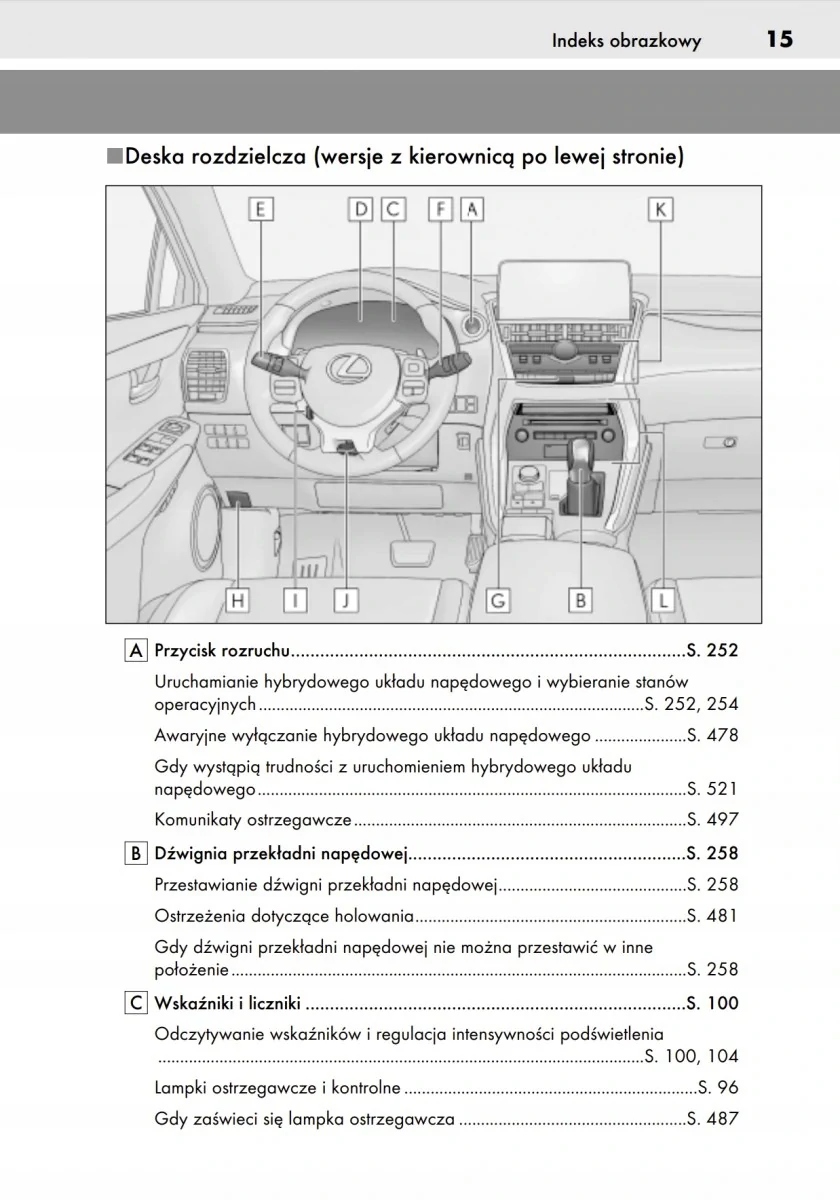 Руководство по эксплуатации Lexus содержит все версии оборудования и полезную информацию о том, как эффективно и безопасно использовать автомобиль, например: - указатели поворота, контрольные лампы открытия и закрытия - освещение и обзорность, сиденья, отсеки для хранения вещей, отопление, вентиляция, кондиционирование воздуха - советы по вождению, эксплуатации, обслуживанию автомобиля - уровни жидкостей, проверка и доливка, аварийные операции, замена колес, предохранителей, замена лампочек - технические данные... и многое другое, дающее путешественникам ощущение безопасности и комфорта. Польское законодательство обязывает продавца приложить к автомобилю руководство по эксплуатации на польском языке. Руководство пользователя автомобиля новое, на польском языке.