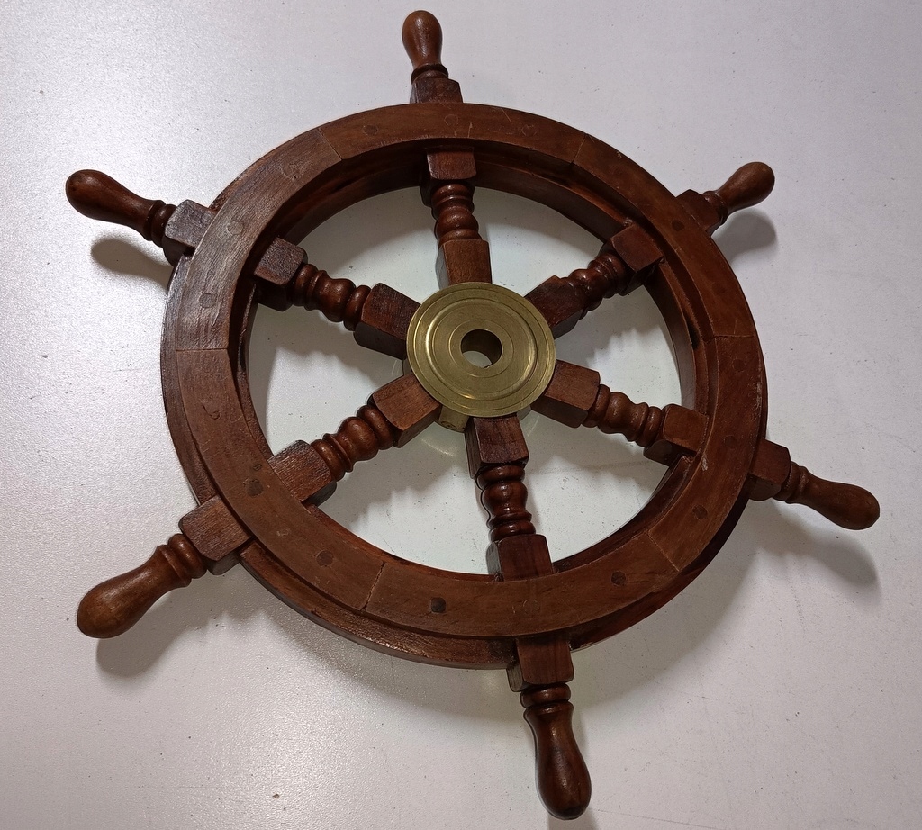 Предмет аукциона – стилизованный руль. Новый, неиспользованный предмет, очень декоративный. Современный вариант из дерева и латуни, идеально подходит для интерьеров портов, ресторанов, кафе, пабов и т. д. в качестве украшения, создающего неповторимую атмосферу.