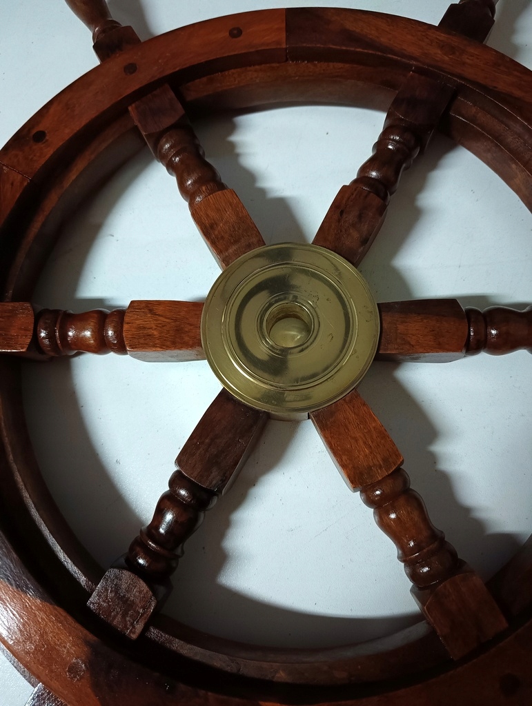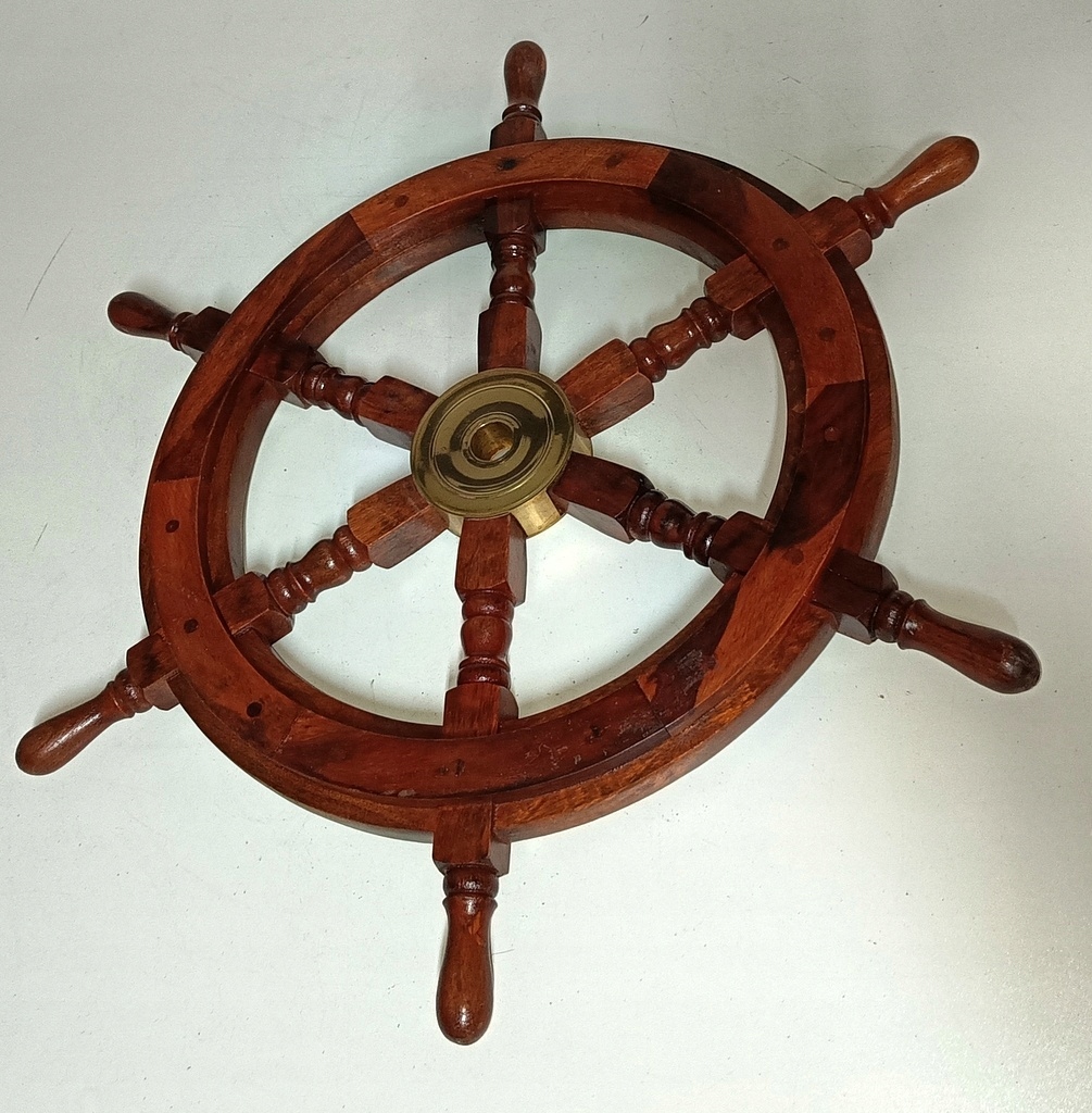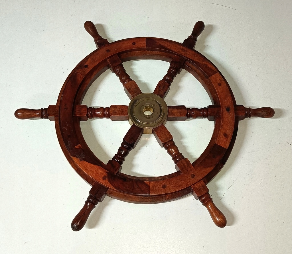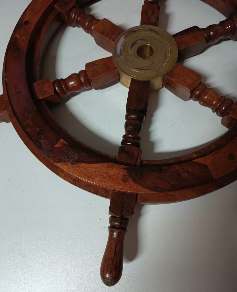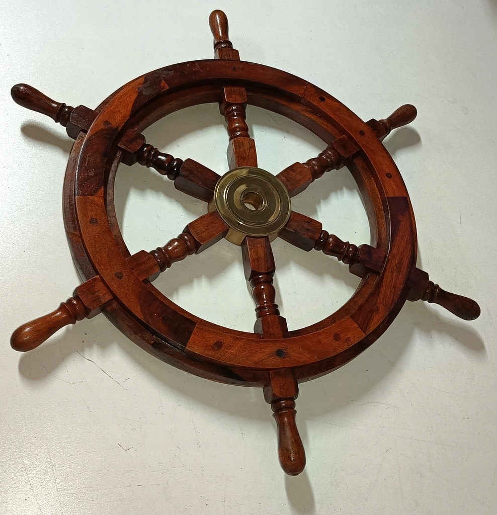 Предмет аукциона – стилизованный руль. Новый, неиспользованный предмет, очень декоративный. Современный вариант из дерева и латуни, идеально подходит для интерьеров портов, ресторанов, кафе, пабов и т. д. в качестве украшения, создающего неповторимую атмосферу.