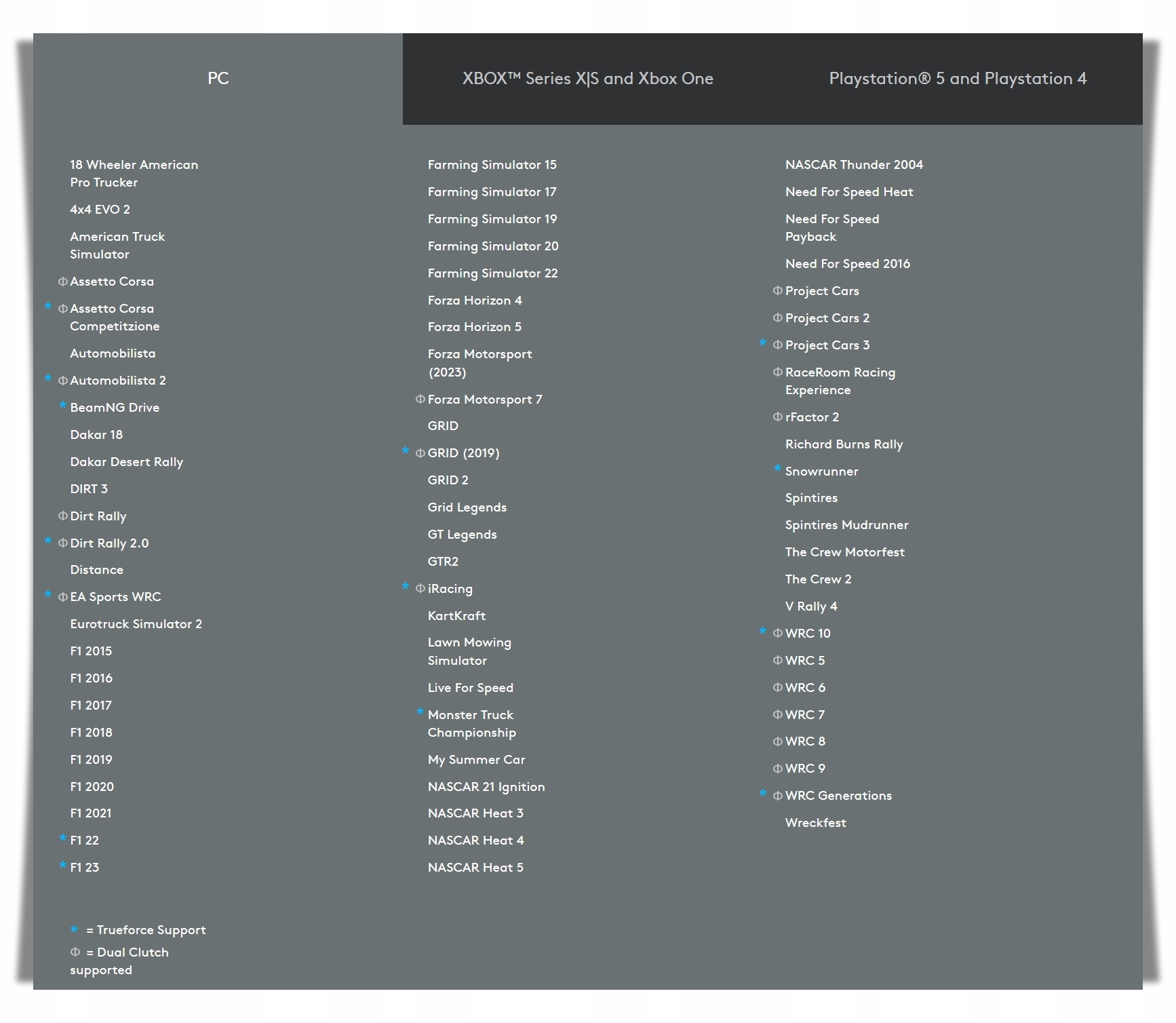 Почувствуйте, как ваши шины ведут себя на каждом повороте и на различных поверхностях. Ощутите все последствия избыточной и недостаточной поворачиваемости при точном скольжении. Почувствуйте каждое изменение нагрузки и пробуксовку, а также дорожные условия, которые их вызвали. Механизм силовой обратной связи с двумя мощными двигателями имитирует различные силы, поэтому вы можете реагировать быстро и правильно.