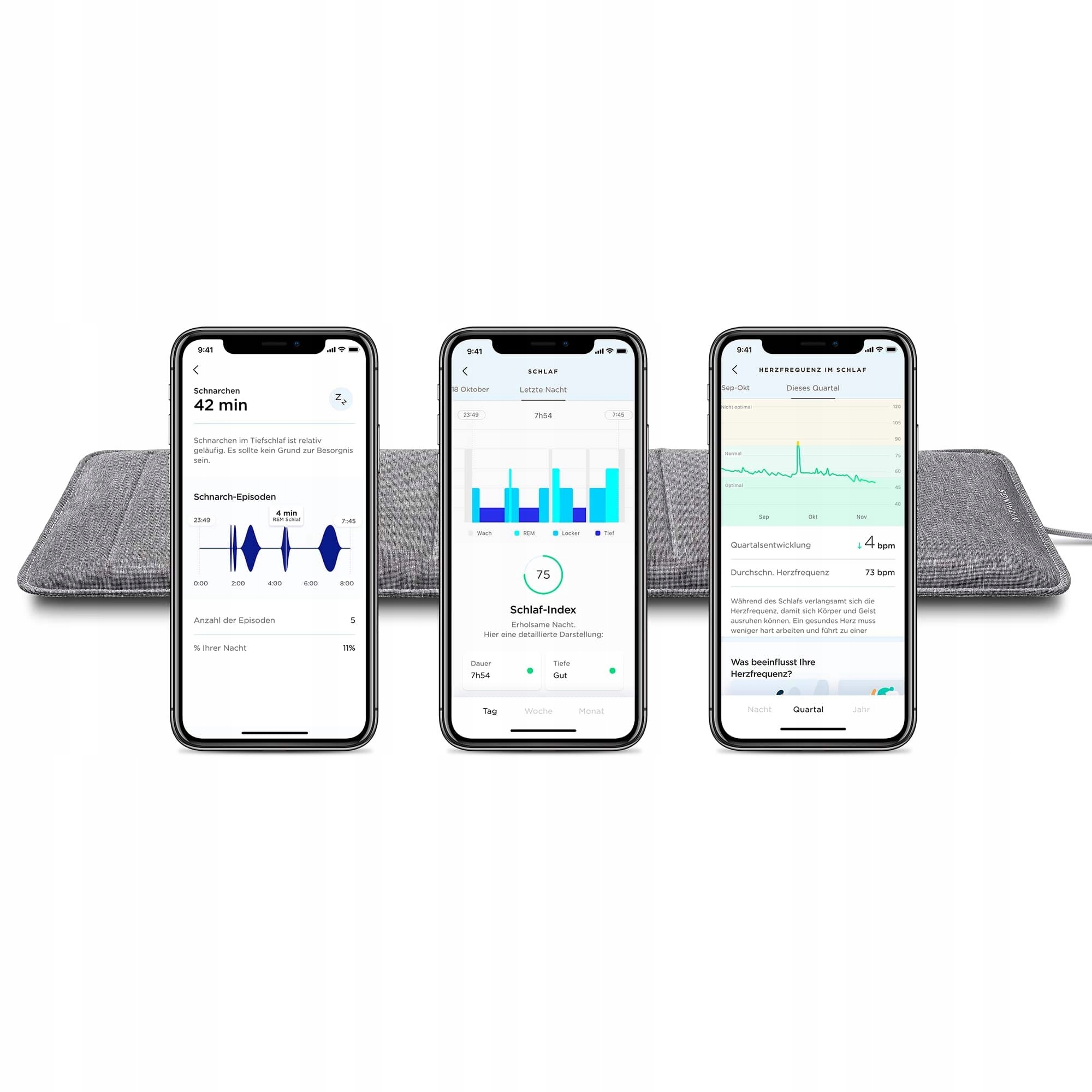 Впервые датчик сна для использования в домашних условиях обеспечивает качество лабораторных исследований, а также дополнительное удобство: его не нужно носить благодаря незаметному коврику, который требует одноразового простого размещения под матрасом. Анализатор сна сочетает в себе самые передовые в мире датчики и технологии для анализа сна и выявления апноэ во сне — распространенного и недостаточно диагностируемого состояния. Благодаря краткой и понятной информации приложения Health Mate каждый может добиться лучшего качества сна и улучшения здоровья. Беспроводная синхронизация: для установки требуется Bluetooth 4.0.