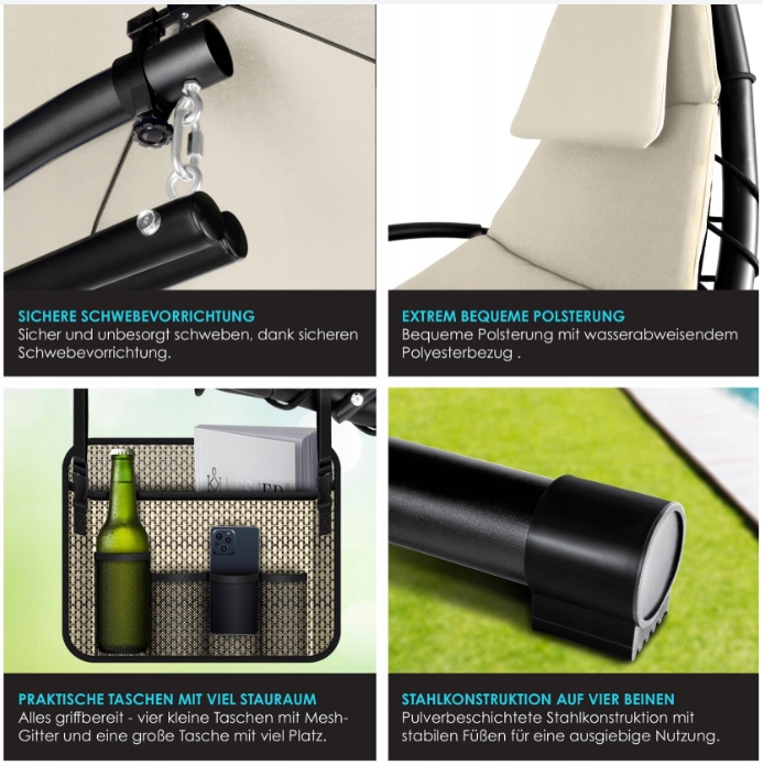 Подвесная солнечная стрельба имеет обивку толщиной 6 см, изготовленную из мягкой, удобной пены, которая поощряет сидеть или лечь и произвести впечатления с деликатными качающимися и вращающимися движениями. Он может выдержать максимальную нагрузку до 120 кг.
