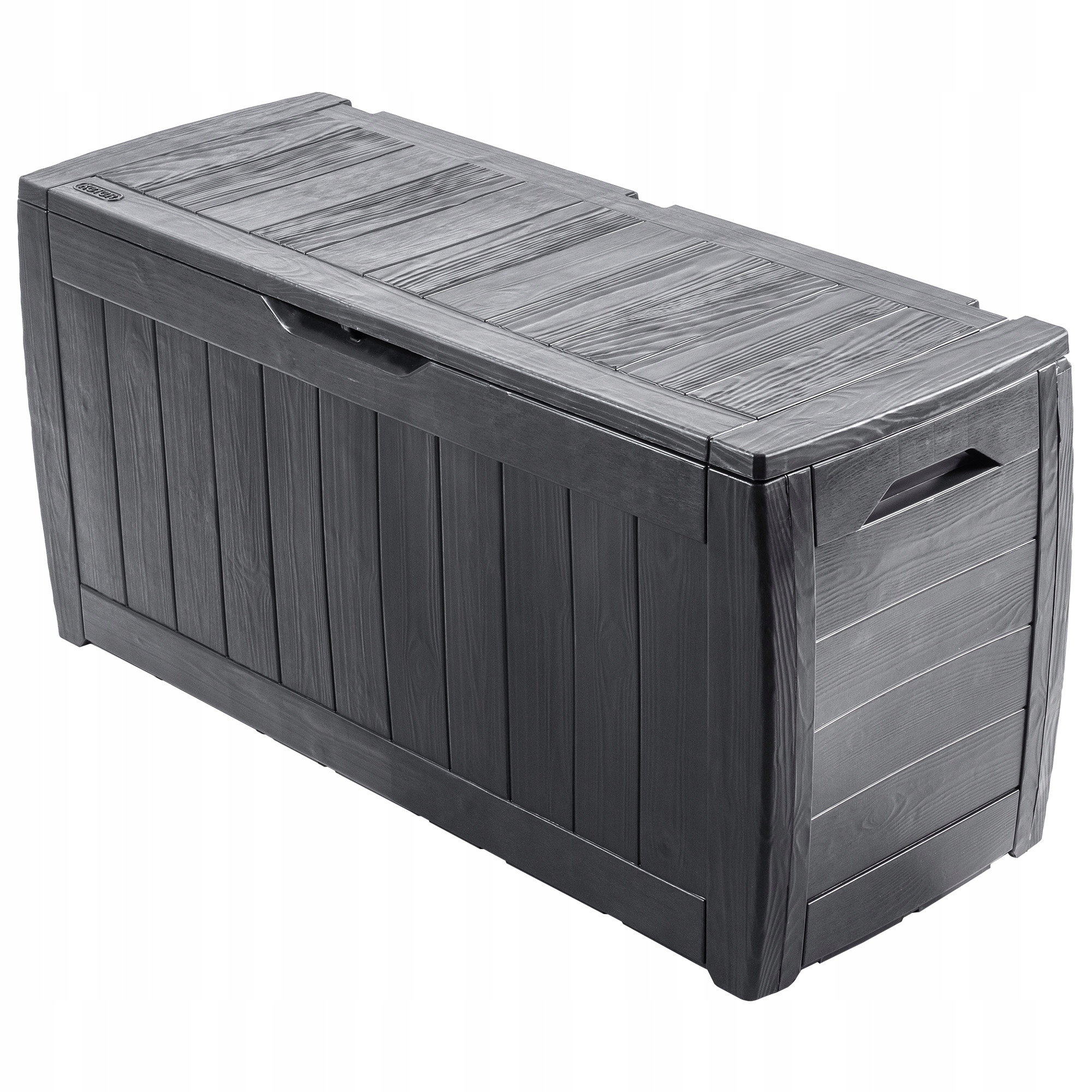 Фактура, имитирующая дерево, впишется в любой интерьер и гармонирует с другими элементами садовой архитектуры. Классические приглушенные цвета не будут утомлять вас долгие годы. Отделение для хранения также отличается удобством использования: две широкие ручки позволят легко переместить его в другое место. Коробка не требует ухода и ее легко содержать в чистоте. Его можно легко собрать без инструментов благодаря элементам, оснащенным защелками.
