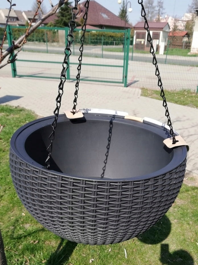 Функциональный висящий кастрюлю, плантатор сферы, отлично подойдет на террасе или на балконе. Горшок привлекает внимание своим первоначальным внешним видом: круглой формой и тарелью. Целое увенчано стабильной ручкой из нержавеющей стали с тремя элегантными цепями, твердо прикрепленными к горшке. Вместимость почти 9 литров гарантирует бесплатную посадку растений, а дренажное отверстие, расположенное на дне, предотвратит чрезмерное орошение. Продукт был изготовлен из пластика высочайшего качества, полностью устойчивым к повреждению или вредным атмосферным факторам, таким как ультрафиолетовые лучи, дождь или снег. Это не требует консервантов и легко чистить. Происходит в трех цветах: антрацит/графит, коричневый и мокко - на этом аукционе антрацит/графит