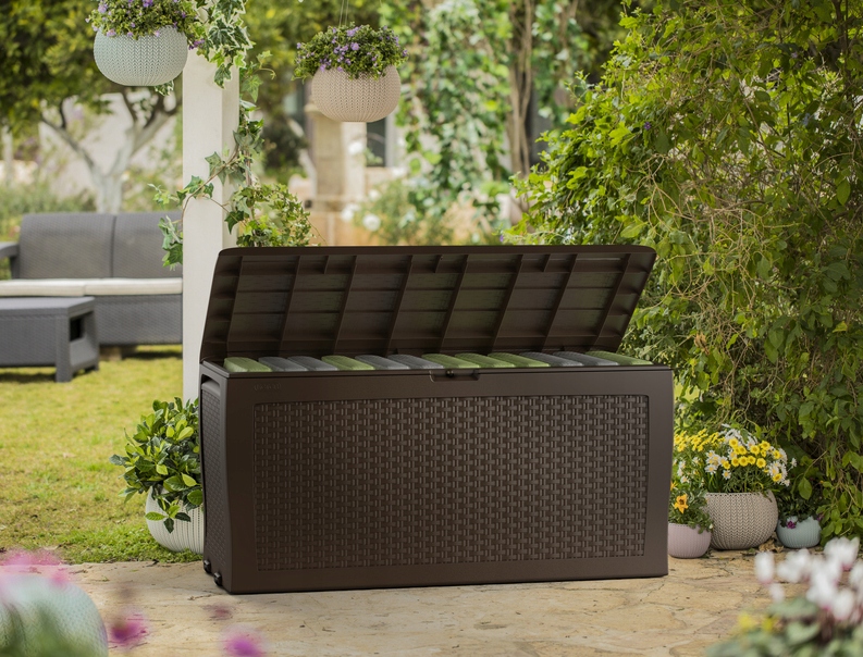 - Вместительный — можно разместить различные виды садовых аксессуаров и инструментов, подушки для садовой мебели или игрушек.