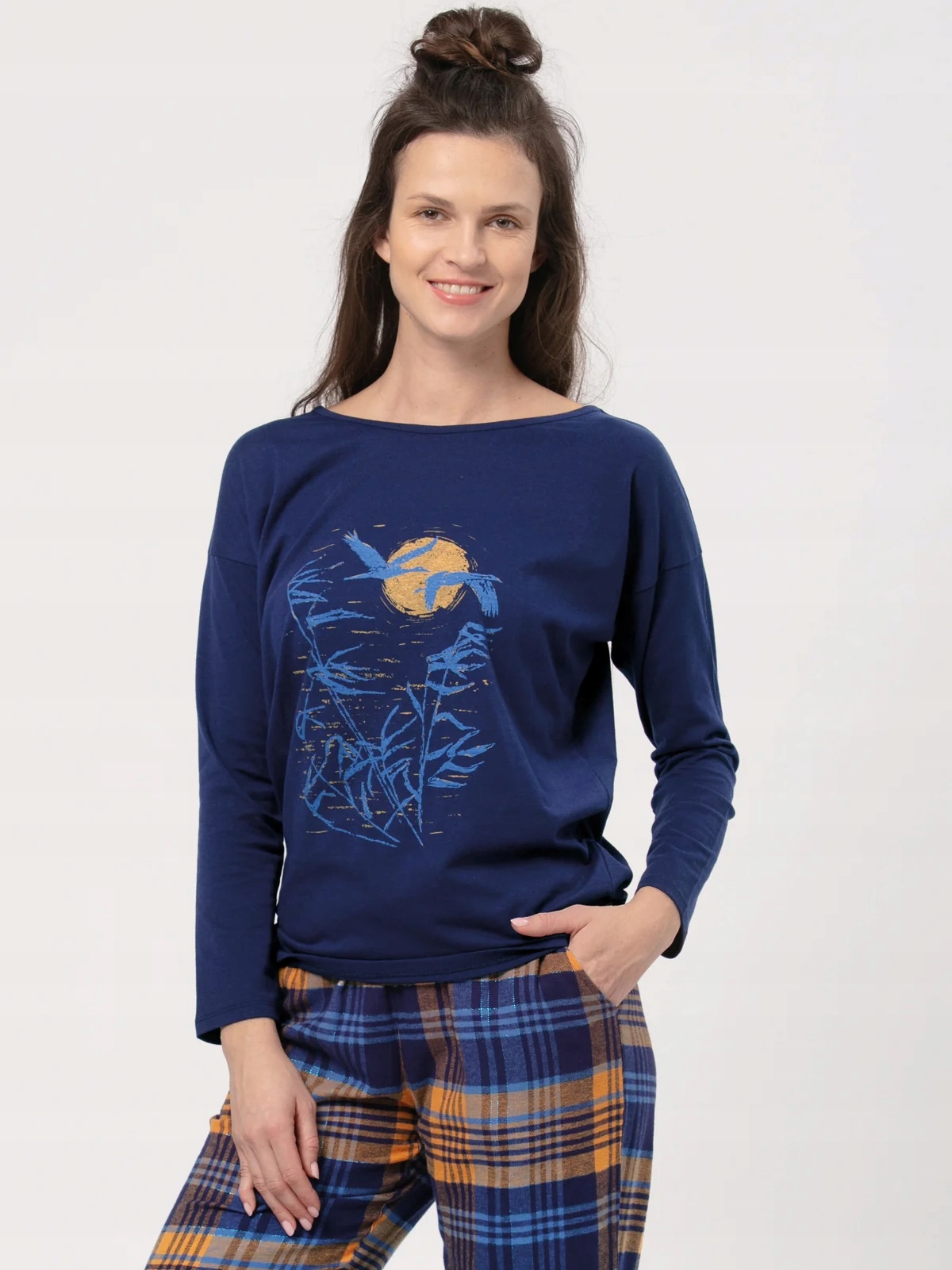 Уникальные, бодрящие цвета золотистого меда и темно-синего цвета поднимут отличное настроение вам и вашему телу. Все это слегка приглушено однотонным темно-синим топом с рисунком летящих журавлей. Свободный крой блузы со спущенным плечевым швом удобен во время сна. В блузке вы быстро почувствуете тепло своего тела благодаря добавлению к хлопку полиэфирных волокон. Они также обеспечивают быстрое высыхание, меньшее образование складок и легкость глажки. Брюки с мягким эластичным поясом – классического кроя. А красивая блестящая нить добавляет им очарования. Прямая нога обеспечивает свободу во время восстановительного сна. Подъем до линии талии прикрывает почки и центр женского тела – живот. Теплая и удивительно приятная на ощупь фланелевая ткань брюк согреет ваши ноги холодными осенними и зимними вечерами. Высококачественные 100% хлопковые волокна в сочетании с подходящей строчкой и нитками обеспечивают долговечность и долговечность использования. В целом мягкая, женственная вещь идеально подходит для зимних поездок!