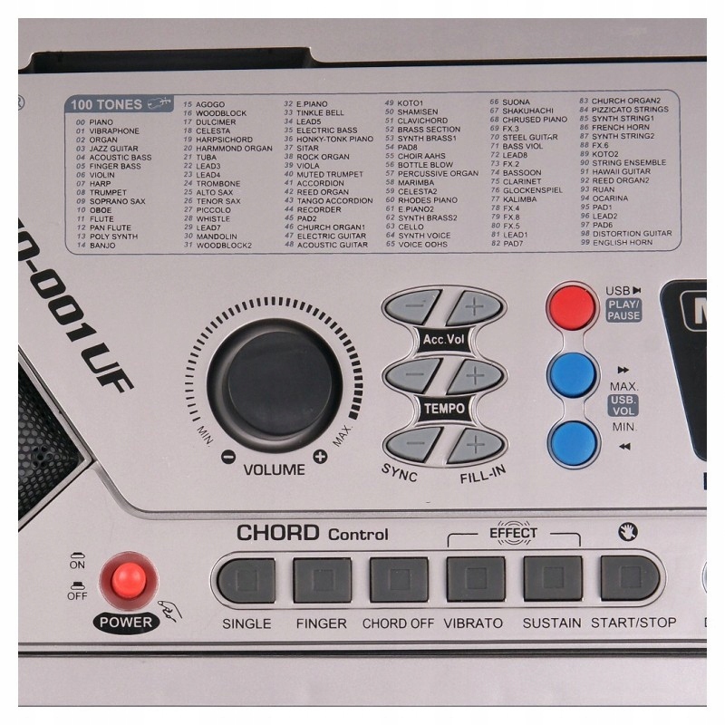 MQ 001 UF KEYBOARD — клавиатура с микрофоном для детей, предлагающая множество интересных функций, и при этом довольно дешевая, оснащенная USB-портом, MP3-плеером и FM-радио, которая является отличным инструментом для развлечения и обучения игре на фортепиано. Аппаратура имеет 61 клавишу, что дает общий диапазон в пять октав. Два внутренних банка памяти содержат 100 различных звуков и 100 ритмических фонов, благодаря которым самые маленькие смогут познавать мир инструментов и популярных музыкальных стилей. Разнообразия вносят звуки животных, перкуссионные звуки и интересно-звучащие эффекты, любимые детьми.