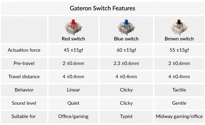 Благодаря своему корпусу и очень низкой задержке (0,2 мс) низкопрофильные механические переключатели Gatheron предназначены для профессиональных пользователей или геймеров, которые хотят печатать на высокой скорости, и имеют срок службы до 70 миллионов кликов, что значительно превышает отраслевые стандарты.