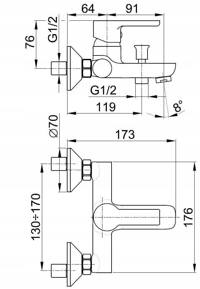 Цвет: хром Монтаж: 2 отверстия Тип: настенный Материал: латунь Элемент управления: керамический Диаметр регулятора: 35 Аэратор: да Расход воды [л/мин]: 20 Рабочее давление [ Атм]: 3 атм Температура воды [°C] Макс.: 90/ 65 Акустическая группа: II Расстояние между соединениями [мм]: 150 ± 15 мм Длина излива [мм]: 150 мм В комплекте: Батарея, эксцентрики – 2 шт. конические розетки с уплотнителями - 2 шт., инструкция установка и эксплуатация однорычажных смесителей. настенная с гарантией, Гарантия: 5 лет на безотказную работу керамических регуляторов Сертификаты и декларации: изделие изготовлено в соответствии со стандартом PN-EN 817, имеет гигиенический сертификат, декларацию соответствия