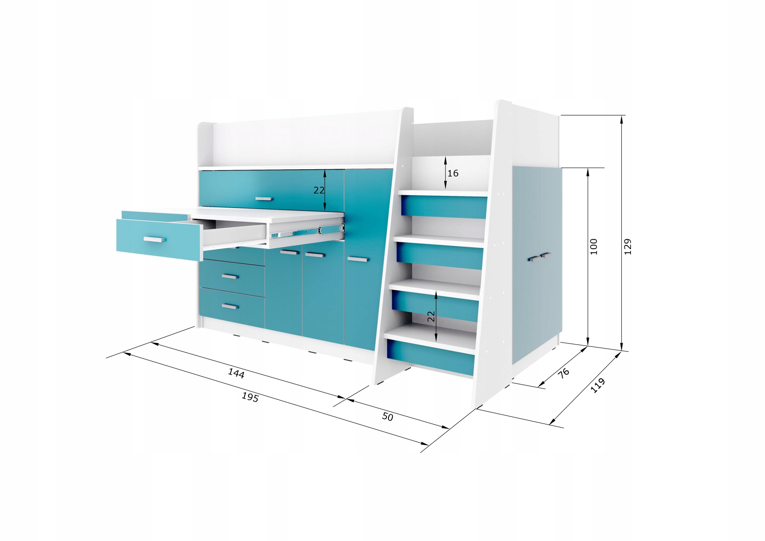 Bunk Bed kiki 1 - последняя модель кровати из серии Kiki. Небольшой размер кровати , а именно, 119 см х 195 см позволит вам разместить мебель даже в очень маленькой комнате, которая позволит вам выделить оставшуюся поверхность комнаты для другой мебели, необходимой в комнате ребенка. kiki 1 - красивый, современный предмет мебели, соответствующий любой комнате. Фронты в коврике, доступные в одиннадцать красивых цветов, дают ему очарование и характер. Эта кровать имеет усиленную структуру, передние элементы и ступени лестницы имеют толщину 22 мм. Благодаря подкреплению нагрузка верхней части кровати до 90 кг.