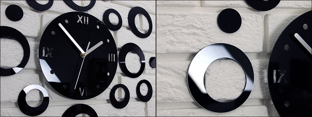 <ул>Установить часы можно быстро и удобно. Циферблат со стрелками можно закрепить на крючке. Декоративные элементы крепятся к стене с помощью монтажного скотча. Каждый элемент проклеен скотчем. У часов есть шаблон — благодаря ему можно точно расположить элементы на стене.