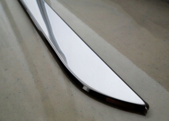 Полоска изготовлена из полированной нержавеющей стали (глянцевая), спрессована из матрицы (край вокруг полосы загнут).
