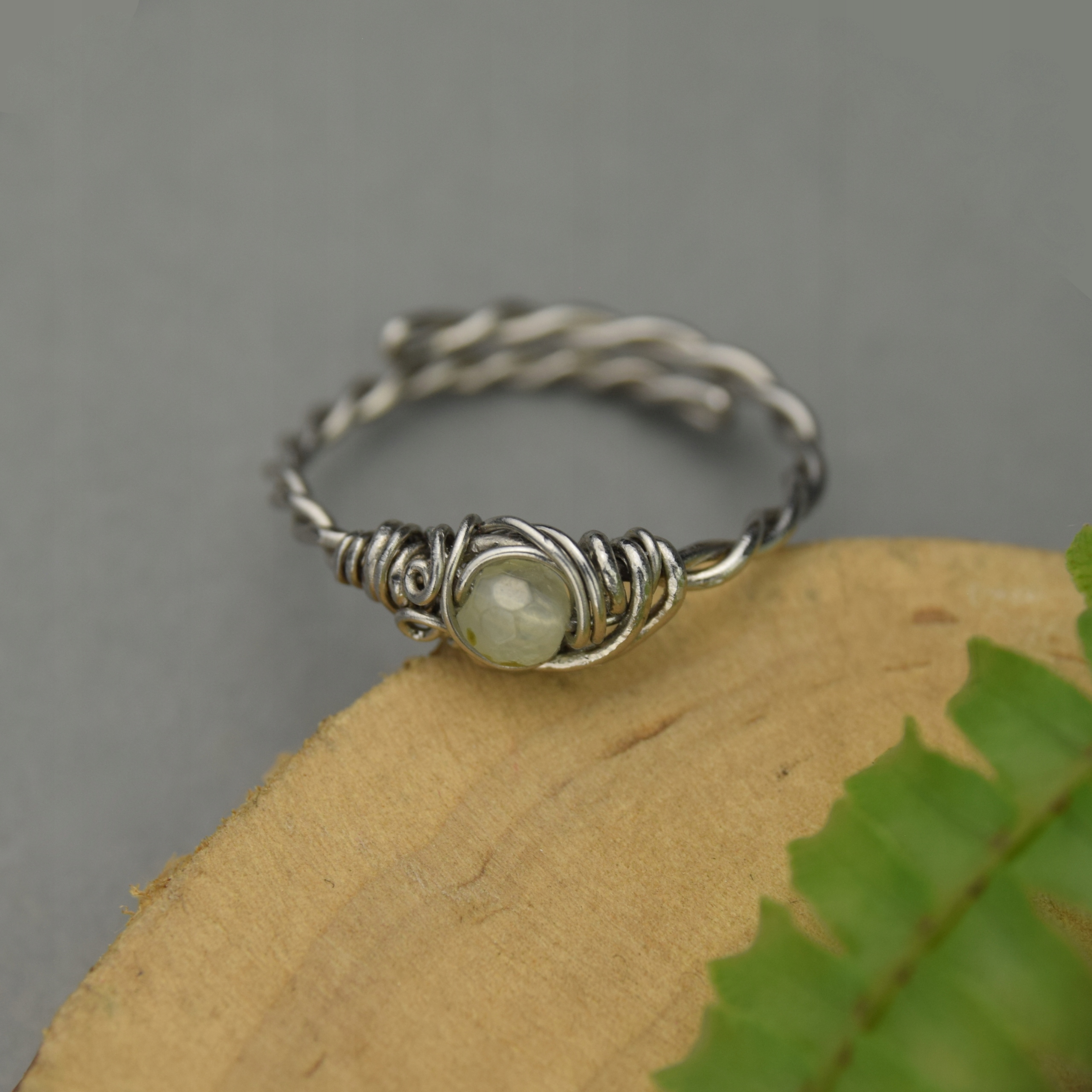 Изысканное кольцо с зеленоватым пренитом, выполненное вручную в технике проволочной обмотки. Полностью изготовлено из хирургической стали.