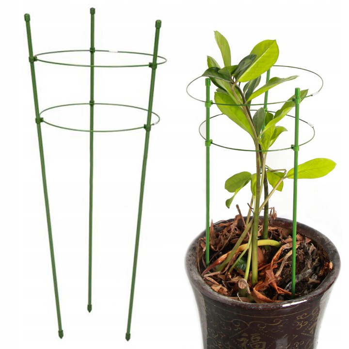 Металлическая опора с кольцом и тремя стойками для поддержки горшечных и садовых растений. Стальные опоры очень прочные, благодаря зеленому цвету становятся практически незаметными на фоне растения.