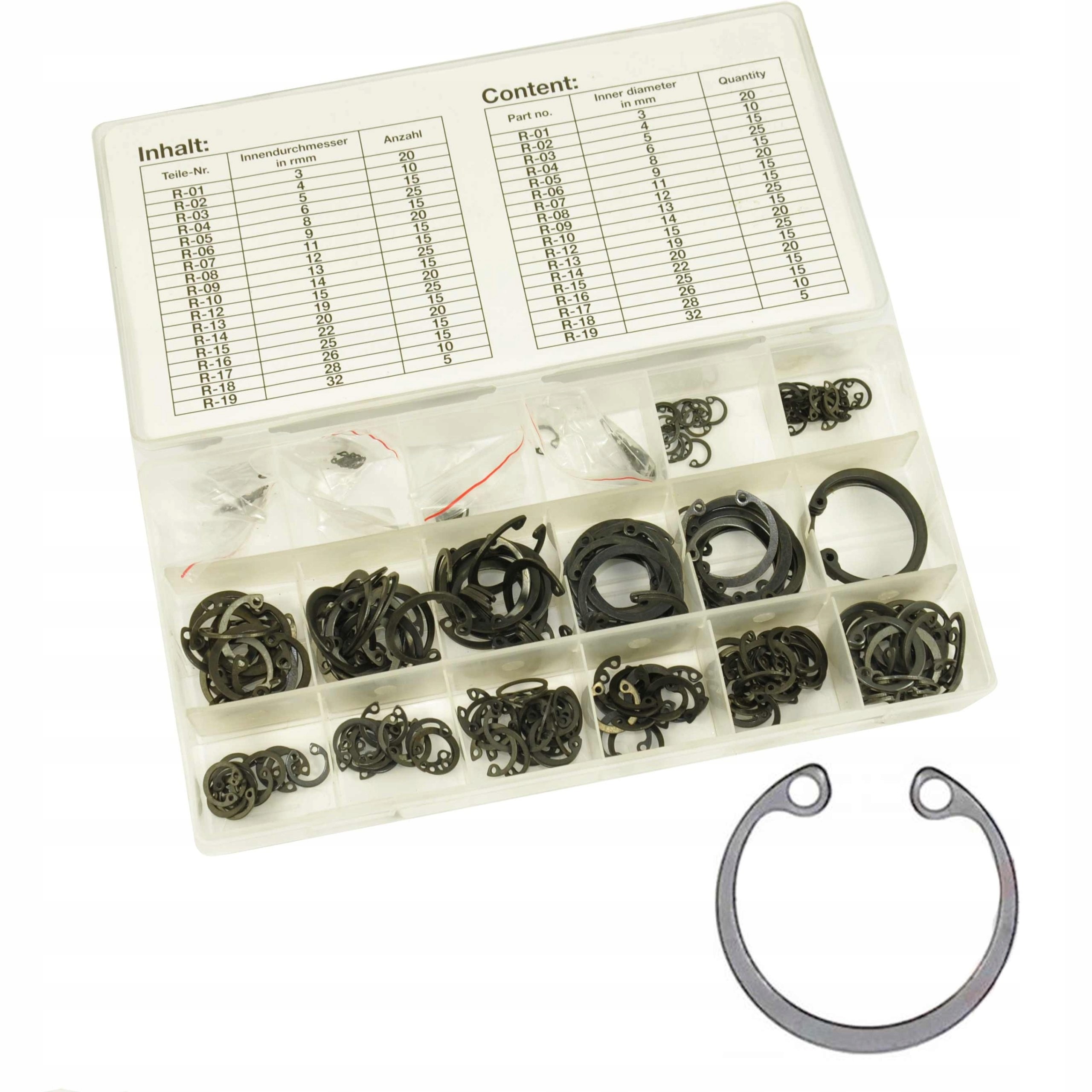- Кольца: - 3 мм - 20 шт - 4 мм - 10 шт - 5 мм - 15 шт - 6 мм - 25 шт - 8 мм - 15 шт - 9 мм - 20 шт - 11 мм - 15 шт - 12 мм - 15 шт - 13 мм - 25 шт - 14 мм - 15 шт - 15 мм - 20 шт - 19 мм - 25 шт - 20 мм - 15 шт - 22 мм - 20 шт - 25 мм - 15 шт - 26 мм - 15 шт - 28 мм - 10 шт - 32 мм - 5 шт