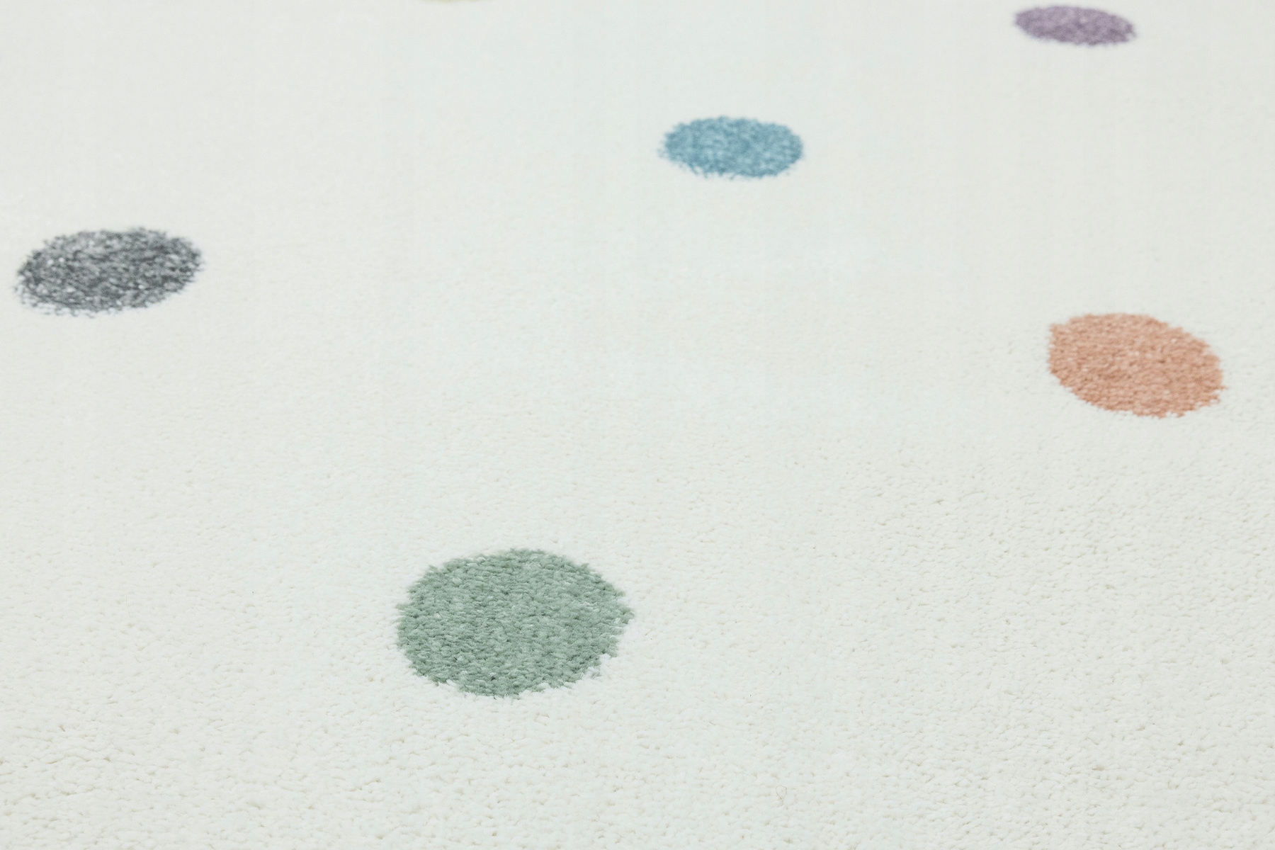 Красочный детский ковер с точечным узором кремового, фиолетового, розового, серого, зеленого, синего и желтого цветов.