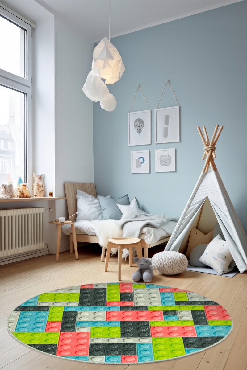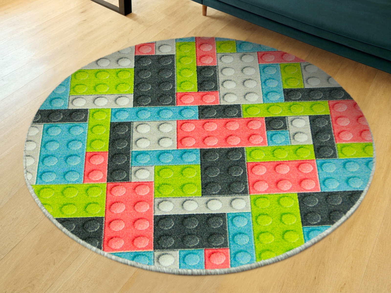 Круглый коврик из ковра BLOCKI имеет оригинальный узор, вдохновленный популярными кубиками, что делает его отличным дополнением детской или игровой комнаты. Геометрическая композиция в динамичном расположении блоков стимулирует воображение и побуждает к творческой игре. Использованные цвета представляют собой гармоничное сочетание оттенков синего, красного, серого и зеленого, которые привносят в интерьер дружелюбную и радостную атмосферу.