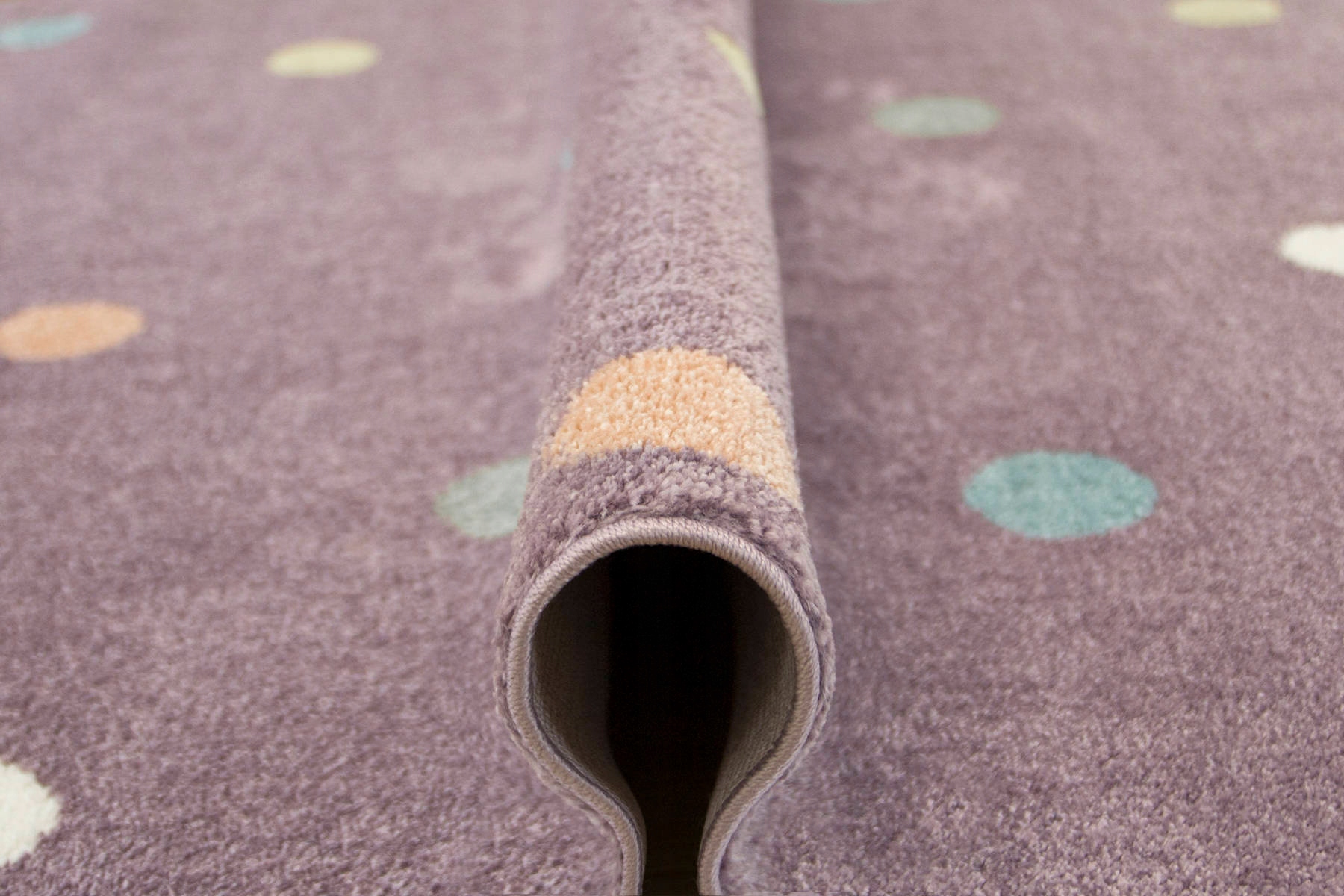 Детский ковер Lima с точечным узором в оттенках фиолетового, розового, бирюзового, желтого, серого и кремового.