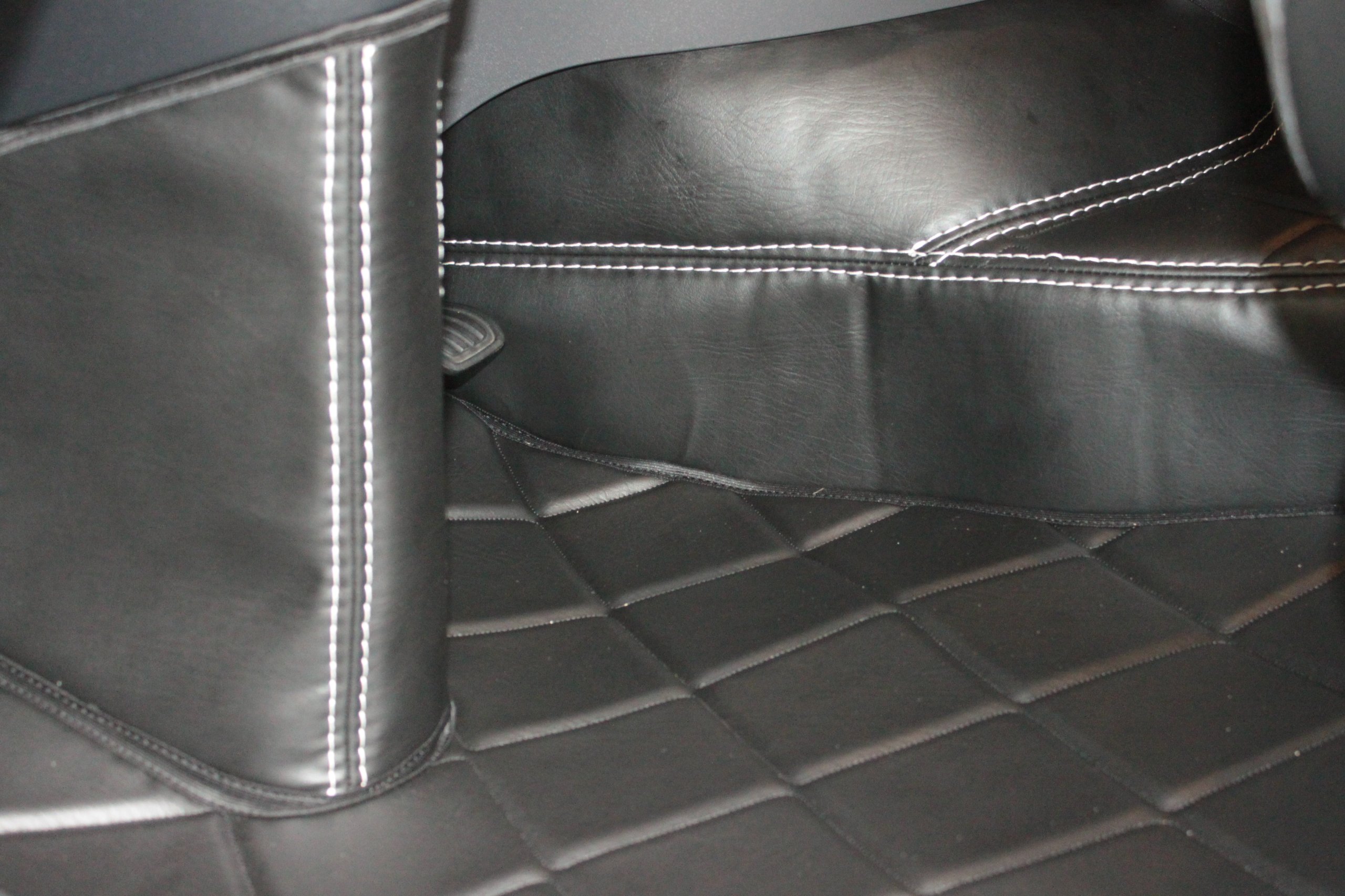 Коврики изготовлены из искусственной кожи комбинированной (ламинированной) с губкой толщиной 10 мм и мотосеткой. Затем все это стегается. Низ ковров проклеен нескользящей прокладкой, которая предотвращает их смещение.