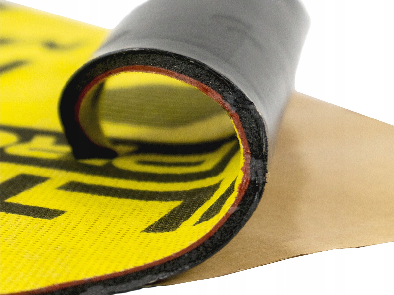 - визуальные особенности: материал многослойный, наружный слой из прессованного флизелина желтого цвета с нанесенной черной графикой