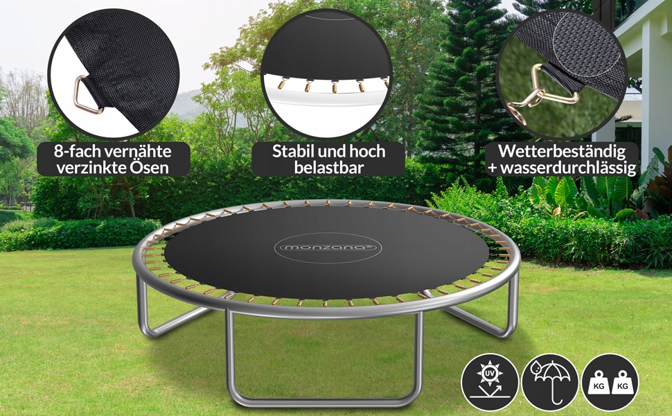 - Универсальное использование – устойчивый к атмосферным воздействиям и разрыву коврик для прыжков Monzana идеален в качестве замены батутов Monzana и других аналогичных садовых батутов. < /li>