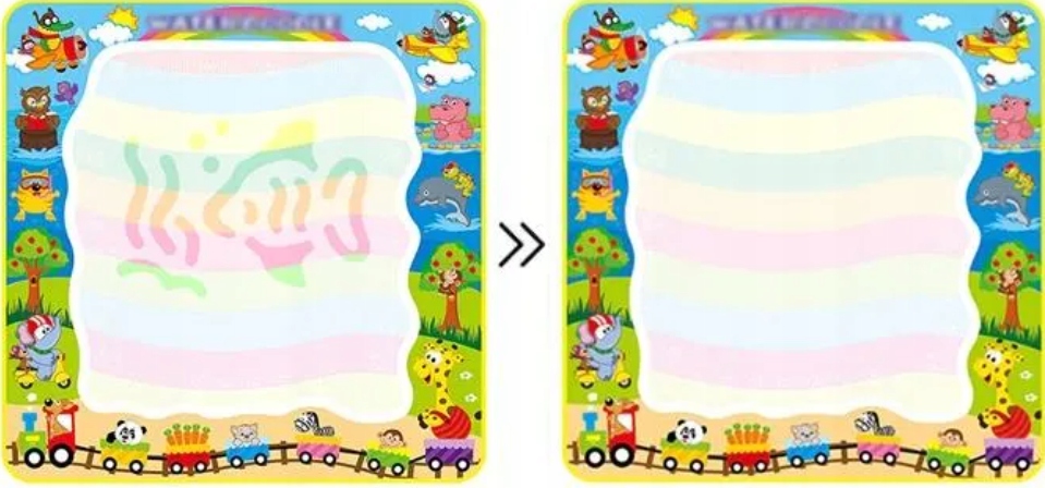 Ребенок рисует водными маркерами на развивающем коврике по собственному творчеству или по шаблонам, входящим в набор, играя на коврике безопасно и не вызывает эффекта, что ребенок раскрасит себя или все вокруг.