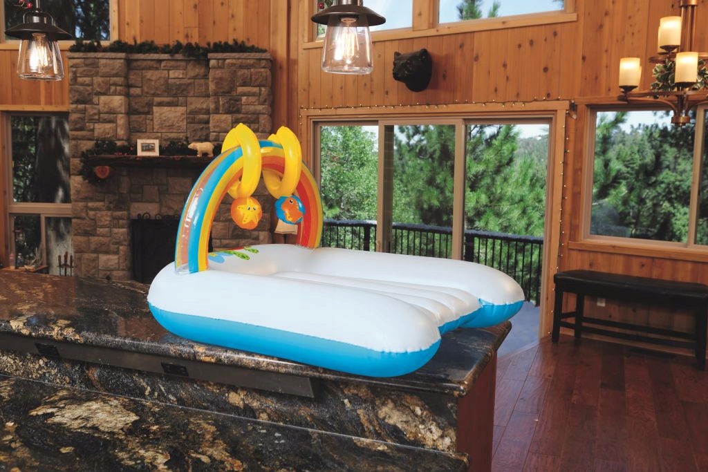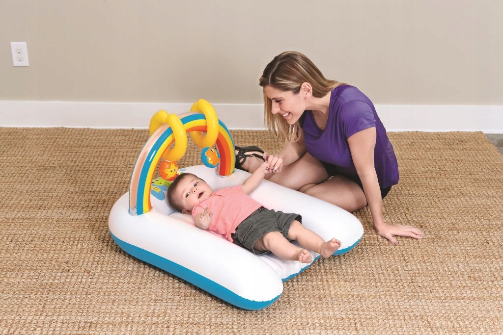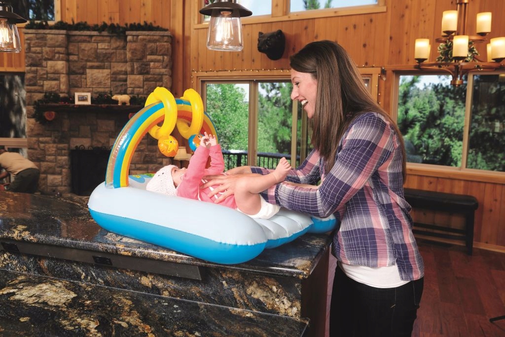 Просто наполните его воздухом, чтобы организовать подходящее место для смены подгузника. Размеры коврика: 81см х 63см х 46см. Встроенная арка с подвесными игрушками развлечет и займет вашего ребенка. Это простой в использовании аксессуар, который отлично подойдет вне дома — в отеле, в кемпинге и везде, где вам нужно подходящее место, чтобы сменить подгузник ребенку.