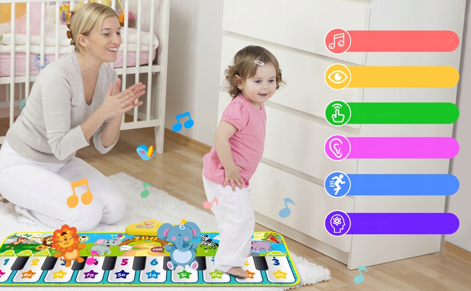 Дети могут не только слушать музыку, но и создавать и записывать собственные мелодии. Наш коврик для фортепиано имеет 8 функциональных клавиш, таких как запись, воспроизведение, одна клавиша, одна нота и многое другое. Благодаря этому малыши могут обнаружить множество звуковых комбинаций и стимулировать их творческие способности.