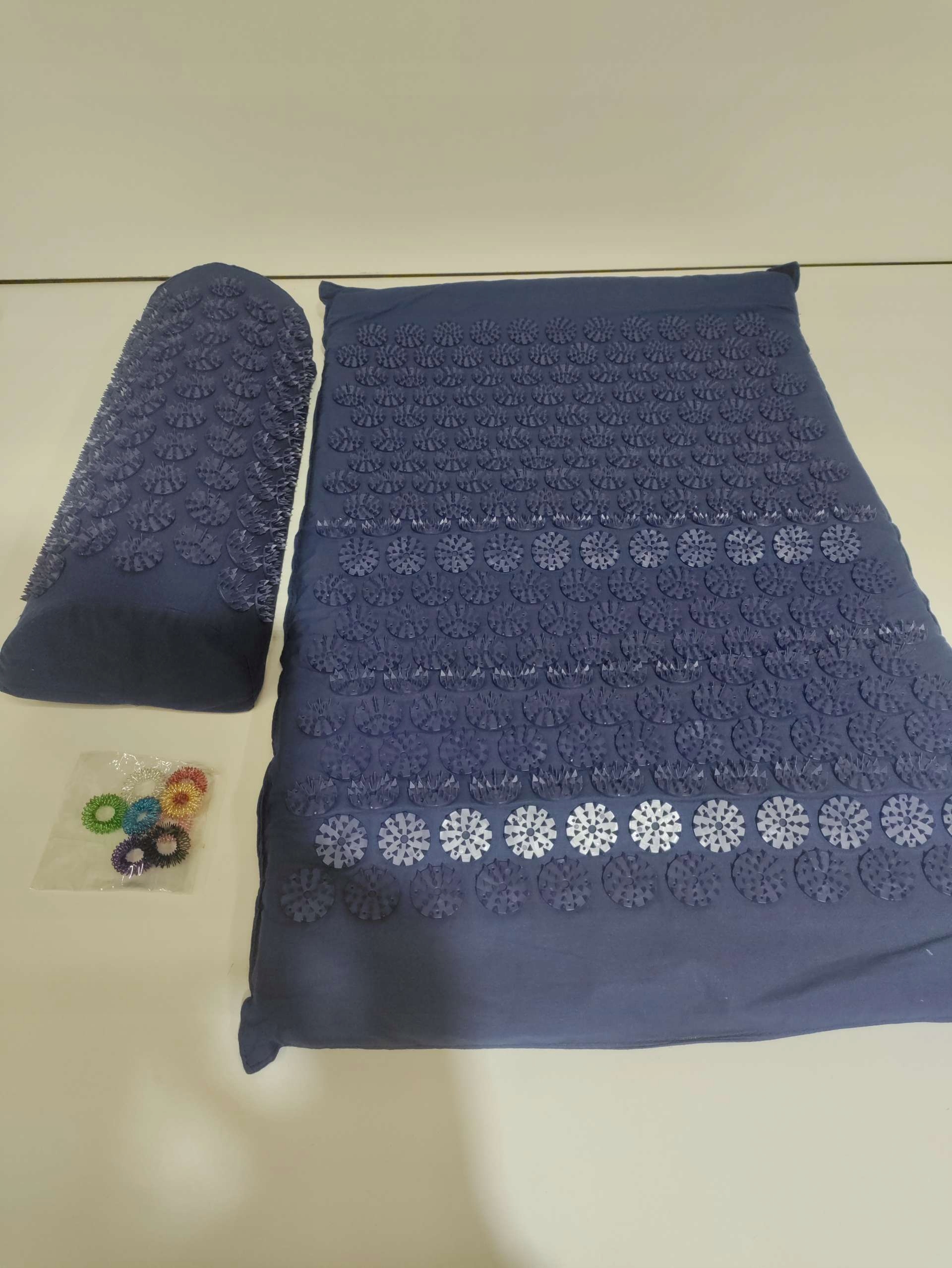 <р> Технические характеристики: <р> Тип: массажная подушка и коврик. <р> Материал: хлопок, пластик, губка. <р> Цвет: темно-синий. <р> Размеры подушки: ок. 37 х 15 х 10 см. <р> Размеры коврика: 68 х 42 см. <р> Вес: 650 г. <р> В комплект входит небольшая деревянная щетка для удаления волос и пыли с акупунктурной подушечки. <р> Комплект поставки: <р> 1 массажная подушка. <р> 1 массажный коврик. <р> 1 повязка на голову для йоги (случайный выбор цвета, сначала черный). <р> 1 сумка для переноски. <р> Особенности продукта: <р> ● Создан для того, чтобы сделать растяжку спины легкой, безопасной, доступной и приятной. <р> ● Акупунктурный массаж позвоночника снимает боли при стрессе и улучшает кровообращение. <р> ● Пластиковые массажные точки обеспечивают больше заряда батареи для массажа, выбирайте их для занятий йогой или сна. <р> ● Хлопковый материал и губка внутри, удобны в использовании для домашнего лечения проблем с позвоночником. <р> Помогает при хронических болях в спине, исправляет постуральный дисбаланс, восстанавливает естественные изгибы и улучшает гибкость мышц плеч и шеи. <р> Подсказки: <р> ● После начала использования вы можете почувствовать легкую боль. После применения на некоторое время снимает боль и усталость в теле. <р> ● Если при первом использовании вы почувствуете слишком большую боль, можно положить на него полотенце. <р> ● Мы рекомендуем вам не лежать на акупунктурной подушечке более двух часов в день, но время от времени лежать на акупунктурной подушечке в течение длительного времени, это не причинит никакого вреда. Многие люди засыпают на акупунктурной подушечке.✅Параметры продукта