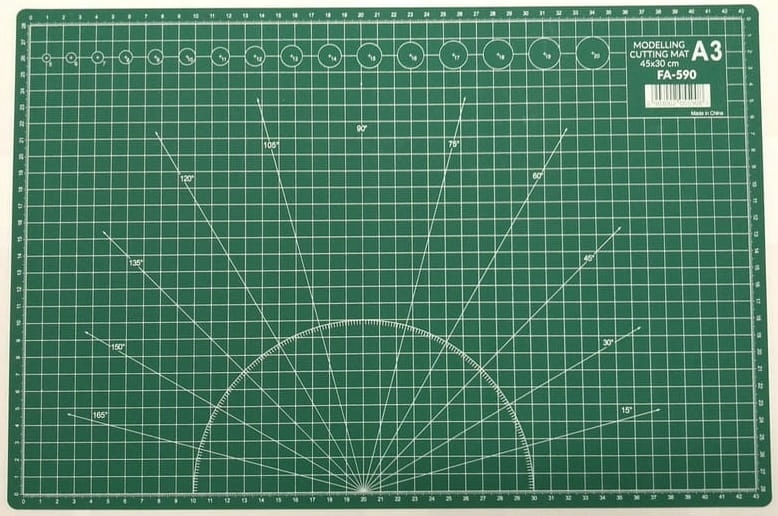 Двойной мастерскую (моделирование) коврик для резки зеленого и светло -серого, в формате, аналогичном A3 (ширина: 300 мм, высота: 450 мм), внешние слои которых были изготовлены из мягкого ПВХ. Из -за дизайна представленного коврика его можно свободно разрезать в ходе моделирования, без риска его постоянного повреждения