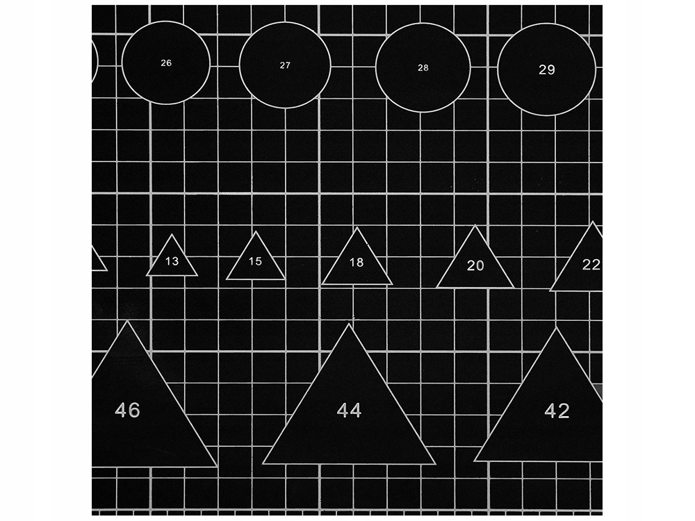 Самовосстанавливающийся коврик для резки изготовлен из специального материала, который частично заживляет при резке лезвием. После резки он остается гладким. С обеих сторон он имеет слой, на котором напечатана сантиметровая шкала по вертикали и горизонтали, с углами, транспортирами, параллельными линиями и фигурами. отмечено.