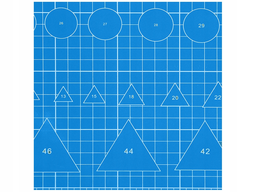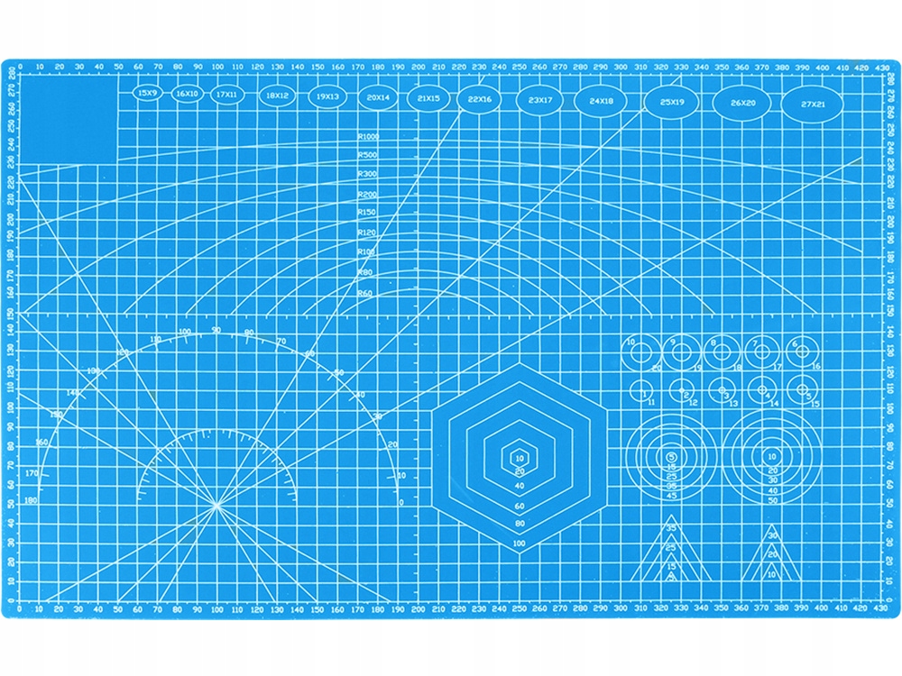 Самовосстанавливающийся коврик для резки изготовлен из специального материала, который частично заживляет при резке лезвием. После резки он по-прежнему гладкий. С обеих сторон он имеет слой, на котором напечатана сантиметровая шкала по вертикали и горизонтали, с углами, транспортирами, параллельными линиями и фигурами. отмечено.