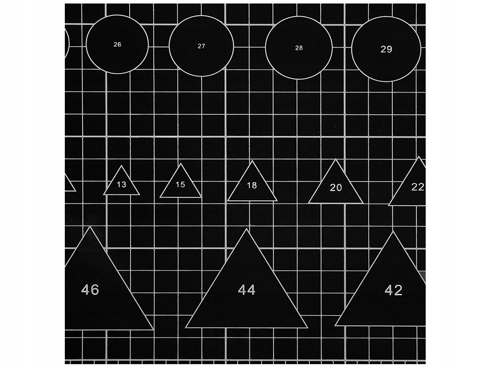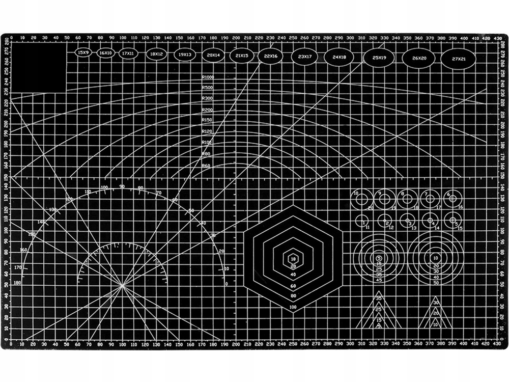 Самовосстанавливающийся коврик для резки изготовлен из специального материала, который частично заживляет при резке лезвием. После резки он по-прежнему гладкий. С обеих сторон он имеет слой, на котором напечатана сантиметровая шкала по вертикали и горизонтали, с углами, транспортирами, параллельными линиями и фигурами. отмечено.