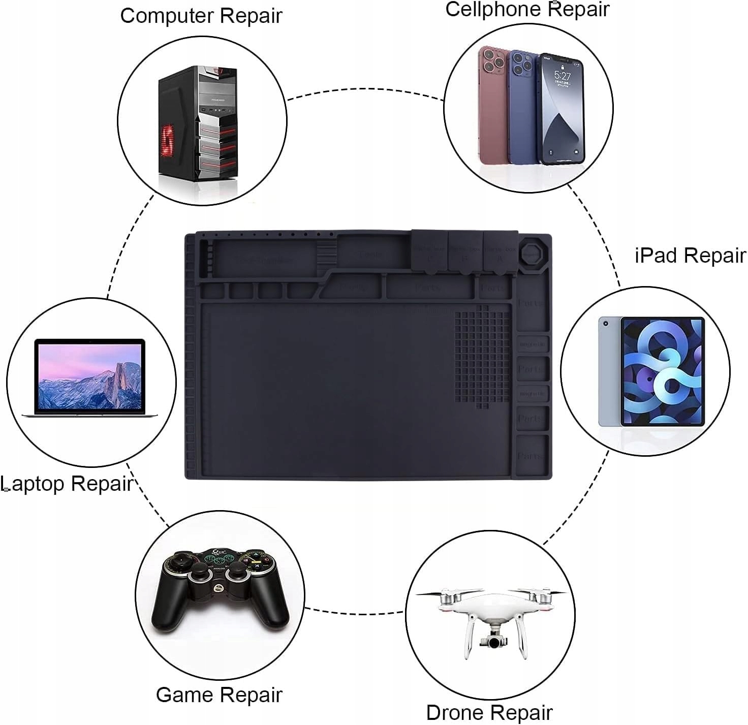Многофункциональный набор для обслуживания силиконовых ковриков необходим каждому любителю и профессиональному любителю DIY. Это значительно упрощает ремонт электроники и пайку. Устойчив к высоким температурам (до 500 градусов Цельсия) и деформации. Имеет 4 магнитные точки: для намагничивания отверток, для деталей и винтов, а также многочисленные отсеки и линейную шкалу в сантиметрах и дюймах.