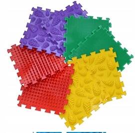 Ортопедический набор состоит из разноцветных модулей, элементы коврика соединены между собой, как пазл. Их можно использовать как дома, так и в детских учреждениях с инструктором. В комплект входит 8 модулей с разной поверхностью.