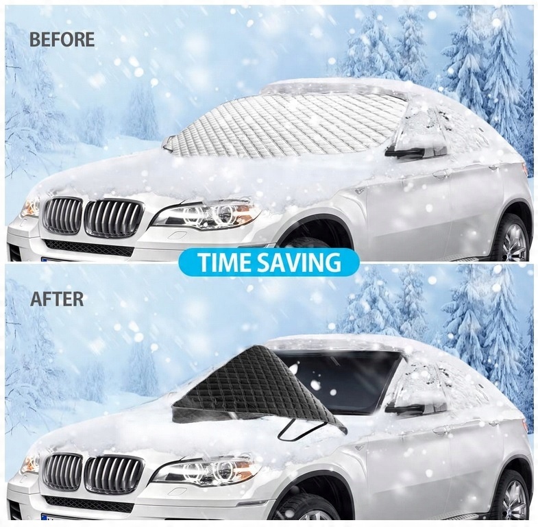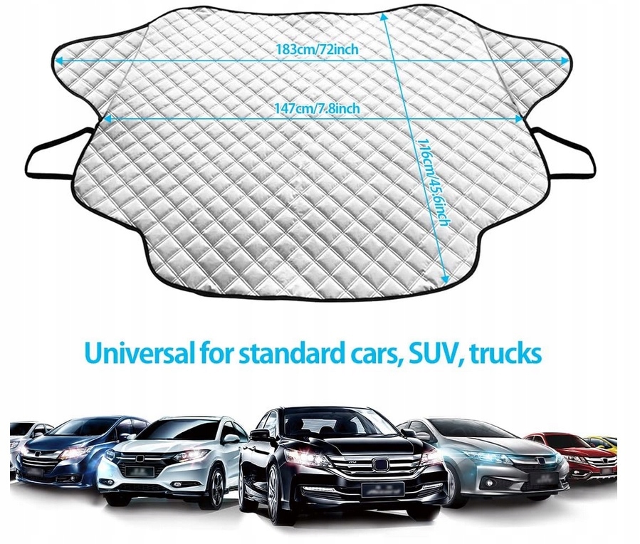 Размеры обложки 183 х 116 см (с ушками). Выдвинутый спереди козырек закрывает щетки стеклоочистителей, подходит для большинства автомобилей и внедорожников. Перед покупкой измерьте лобовое стекло.