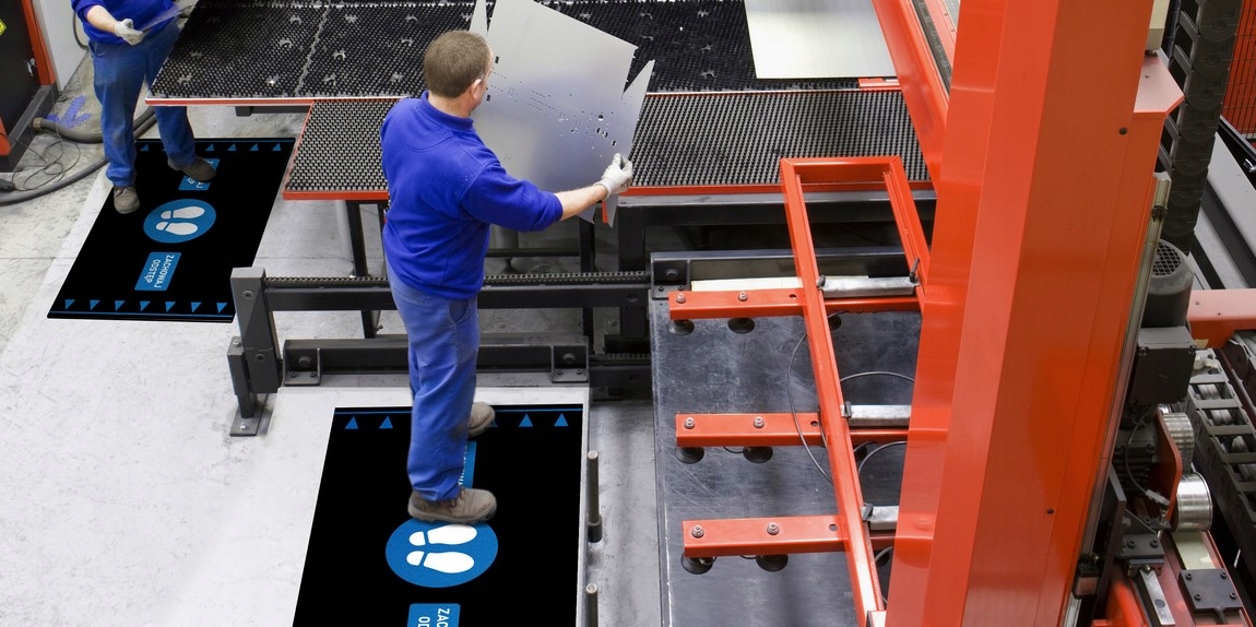 Коврик оснащен принтом с графикой и надписью « Соблюдайте дистанцию», что ясно сигнализирует об особой осторожности на рабочем месте. Промышленный коврик позволяет улучшить эргономику и безопасность работы.