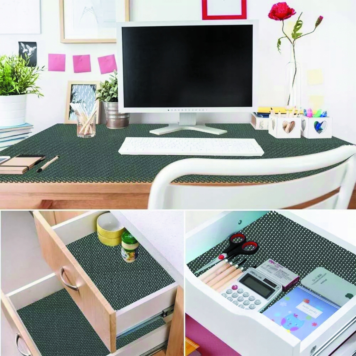 Противоскользящий коврик обладает антибактериальными свойствами и устойчив к ультрафиолетовому излучению, что позволяет легко избежать пятен. Противоскользящий коврик легко чистится и идеально подходит для использования в домашних и кухонных ящиках в качестве нескользящих вставок и подкладок.